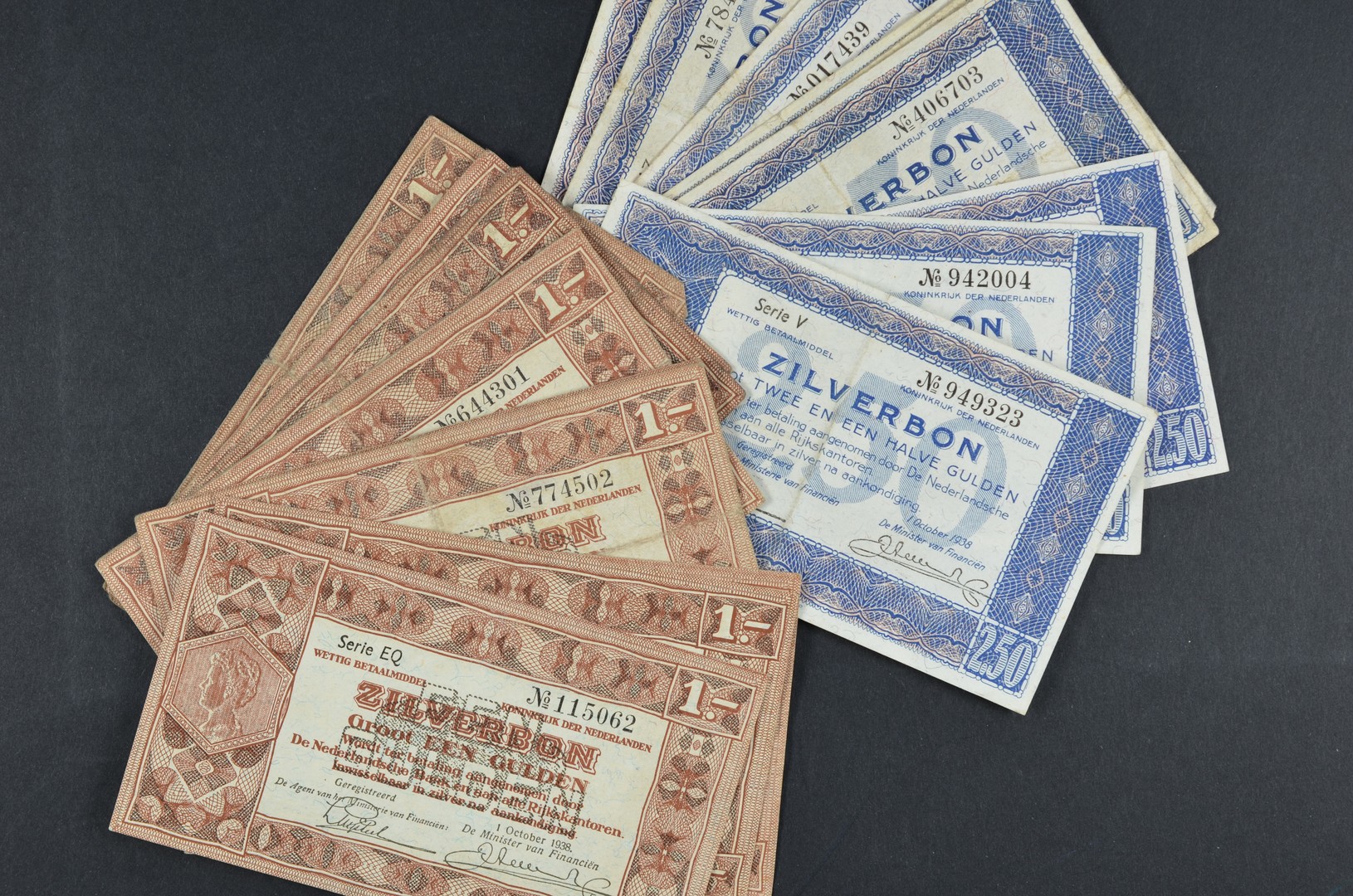 PAPIERGELD, Zilverbonnen 1 en 2½ Gulden 1938 (1 tot 12 x) en 2½ Gulden 1949 (8 x), fraai/zeer fraai