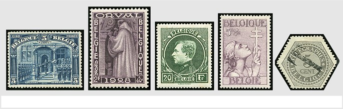 BELGIË, leuke voorraadstock o/*/** in 5 insteekboeken en 1 ringband, met nog heel aardig materiaal, wb. Port, Telegram, etc.