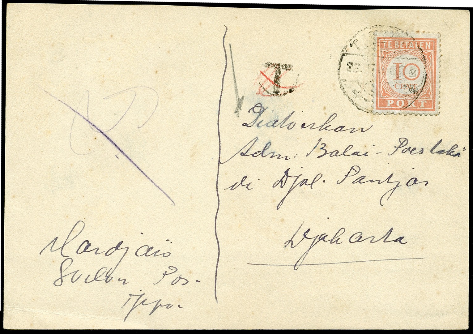 10 Cent postage due no. 6b on homemade postcard from Tjepoe 22.5.46 (type 050) to Djakarta and 5 sen definitive no. 77 on homemade postcard from Djokjakarta 31.1.46 to Djakarta