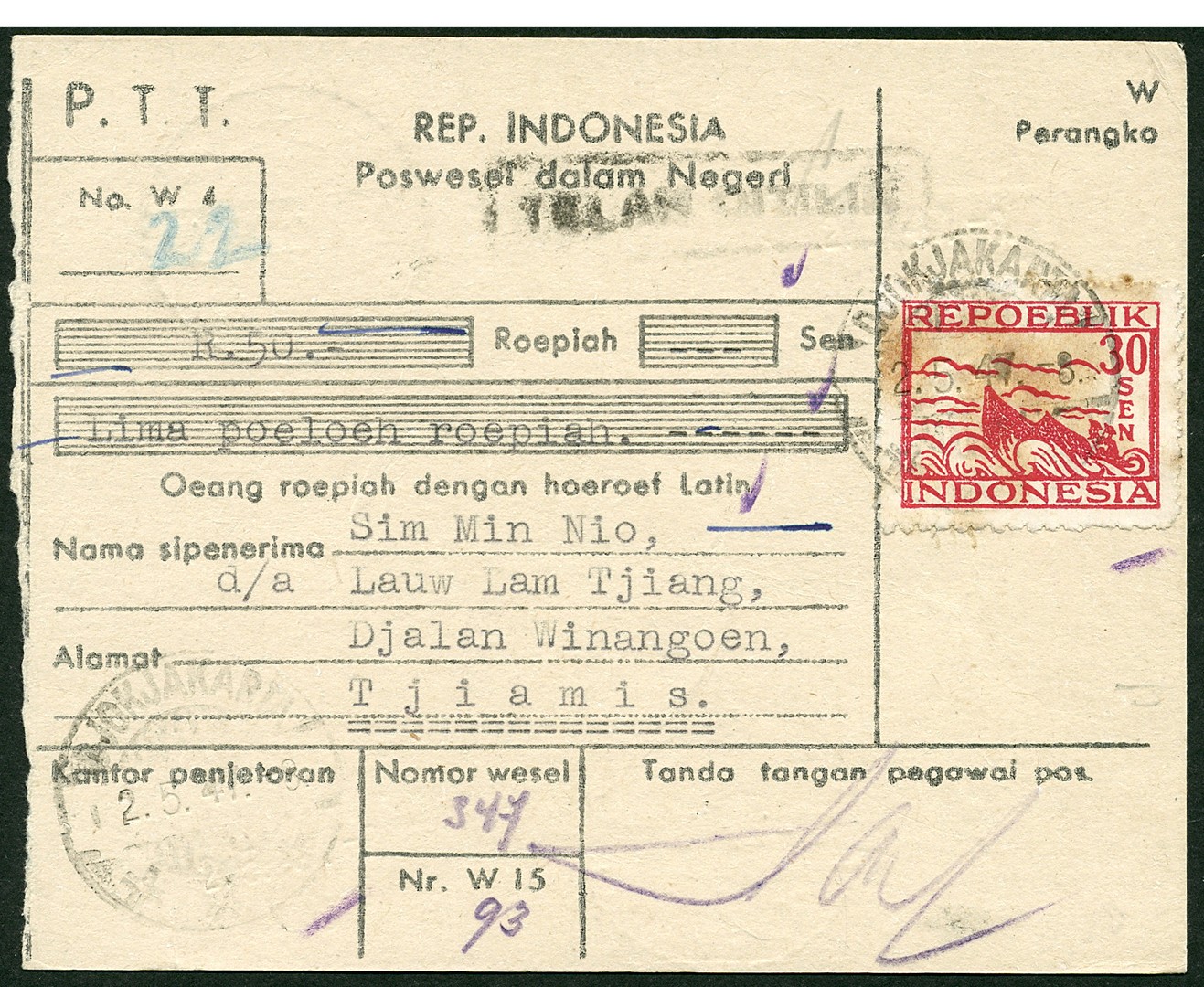 30 Sen no. 027 on M.O. Bu.RF6 from Djokjakarta 2.5.47.-8 to Tjiamis 4.5.47.-8. Censor Bu.RC1b
