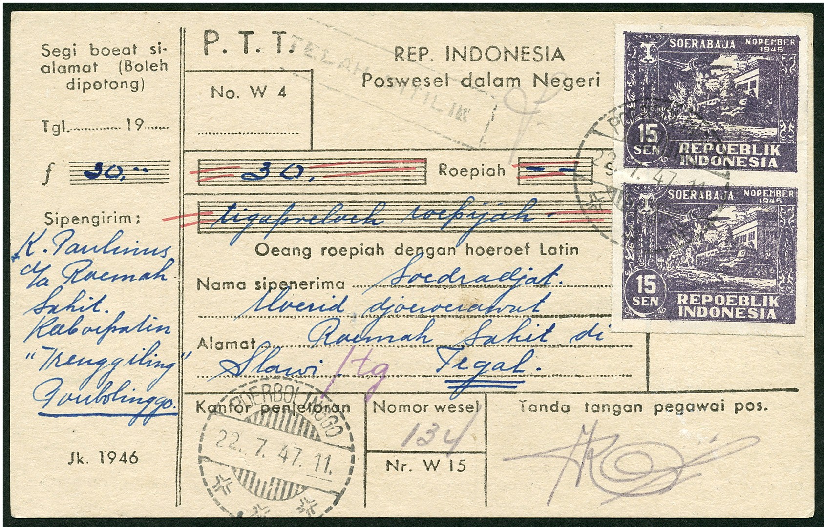 15 Sen no. 031A in pair on complete M.O. Bu.RF6 from Poerbolinggo 22.7.47.11 to Slawi (no arrival pmk). Censor Bu.RC1b