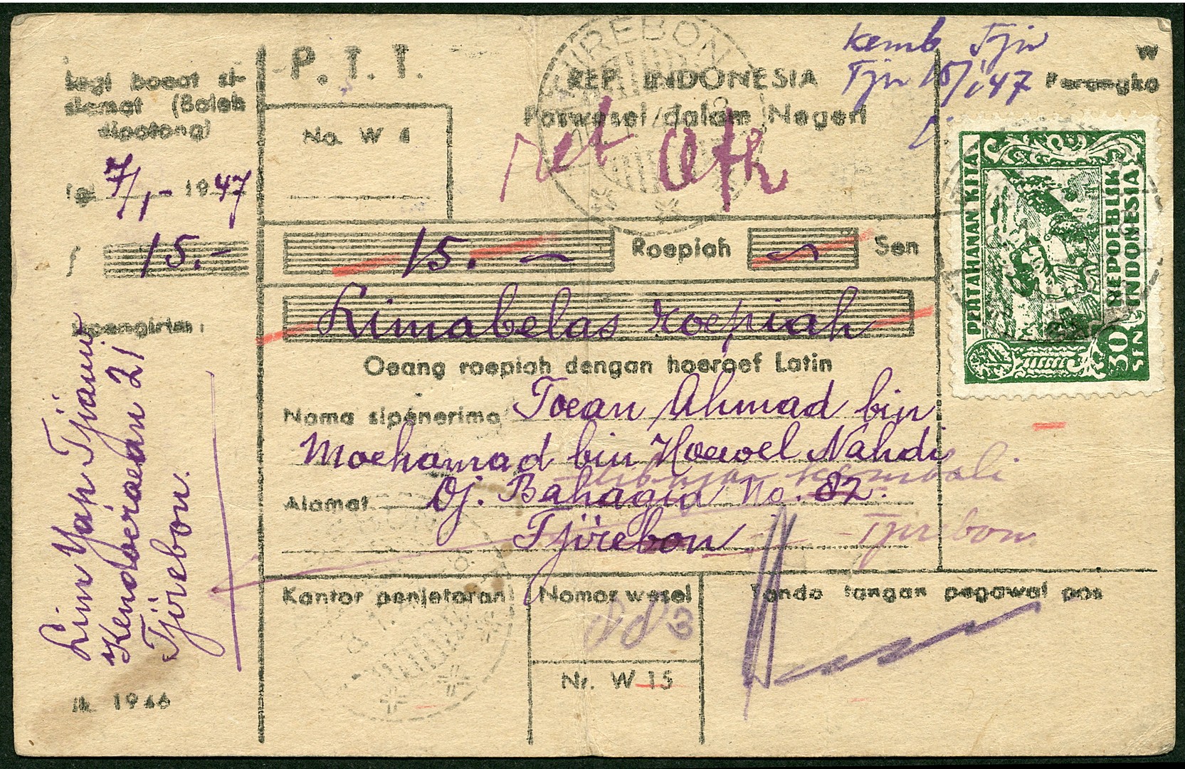 30 Sen no. 032 (damaged) on complete M.O. Bu.RF6 (crease) from Tjirebon 8.1.47.-8 but on 15.1.47.13 returned to sender (written 'ret afz' and 'kemb Tjn / Tjn 15/1'47')