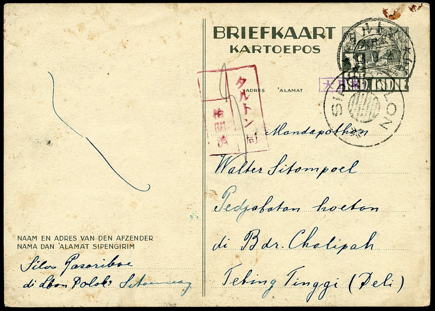 3½ Cent postcard (few spots) with violet Dai Ni Hon overprint in frame Bu.164b from the delivery house SIPOHOLON (type 071) via Taroetoeng 18.9.2 to Tebingtinggideli. Censor Bu.JC14a. Extremely rare pmk (vNV.RRR). Ex Hiegentlich