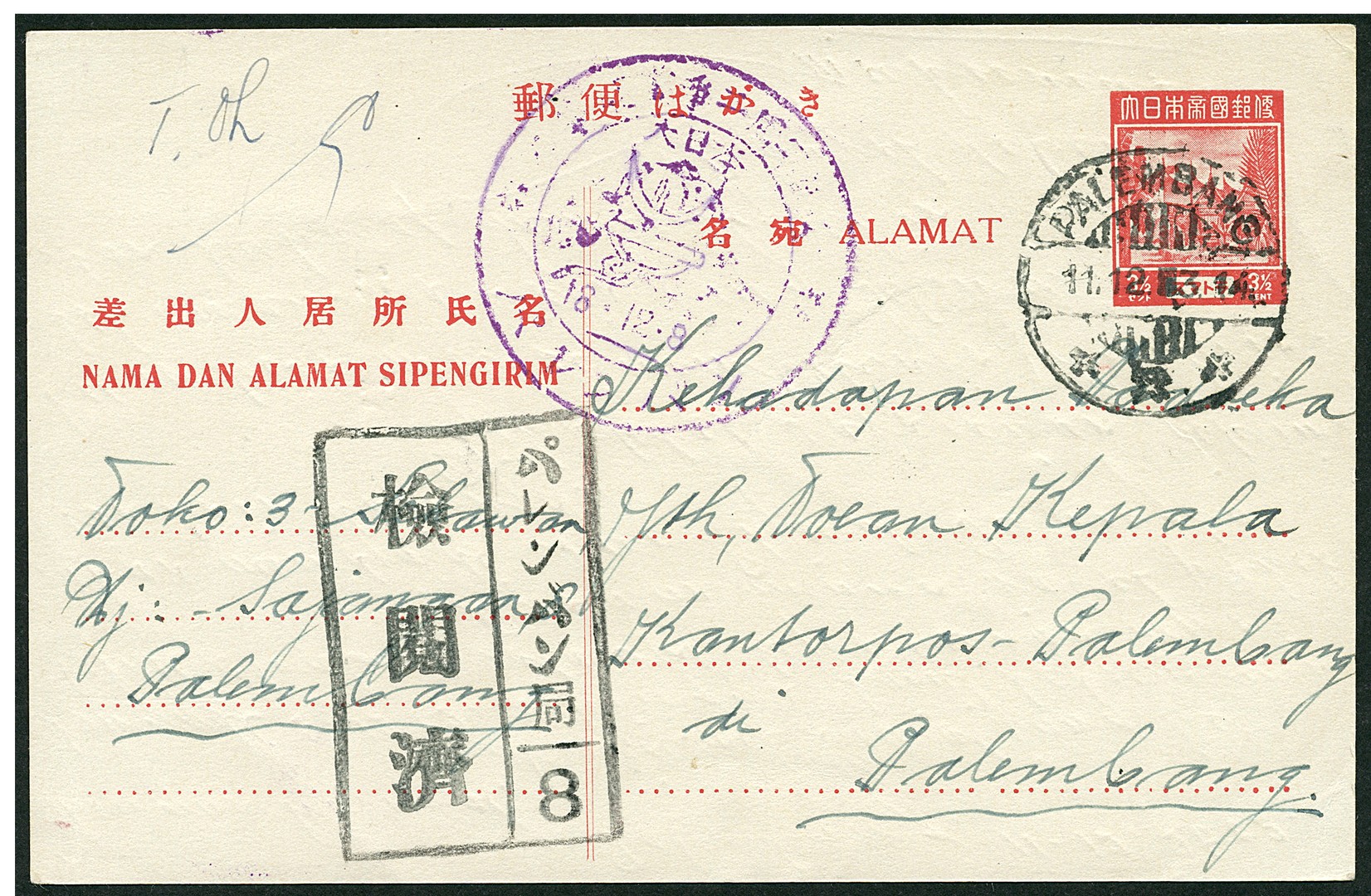 3½ Cent postcard Bu.189c showing commemorative cachet '2nd Anniversary of the Great East Asia War' in violet (type 422v) locally sent Palembang 11.12.3.14. Censor Vr.301 from Palembang