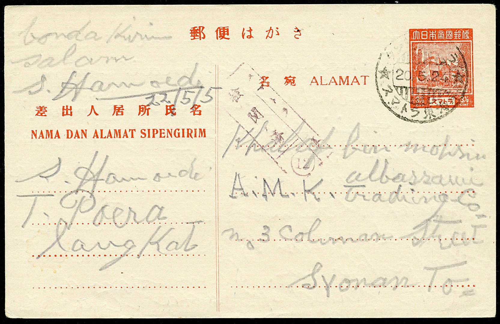 3½ Cent postcard Bu.189. Four censored copies, from Palembang 19.4.11 to Djakarta, from Tandjongpoera 20.5.24 to Singapore, from Padang 20.2.24 to Djatinegara (Java) and from Tandjongkarang 19.4.24 to Djakarta