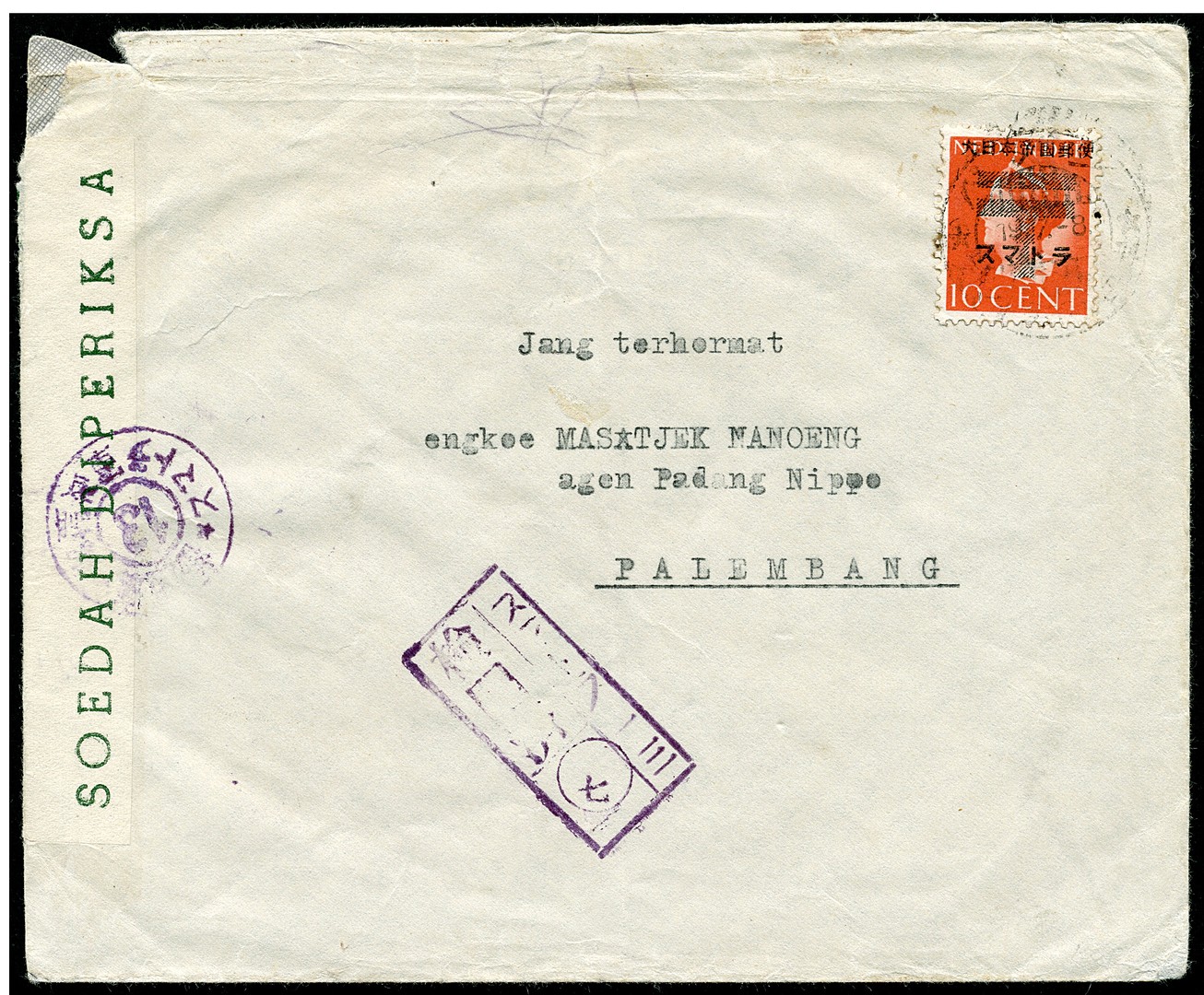 10 Cent van Konijnenburg with machine T-overprint no. 92z-43'bg on cover from Padang 19.7.-8 to Palembang. Censor Bu.JC15 and censor label Bu.JCS5a, cancelled JC17 number 13 of Padang