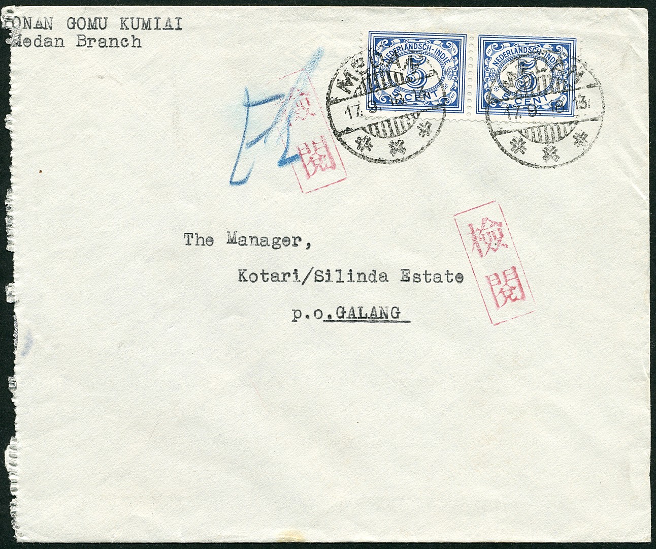5 Cent numeral without overprint no. 42 in pair on cover from Medan 17.9.18.13 to Galang. Sewing machine censor at left, censor mark Bu.JC12a