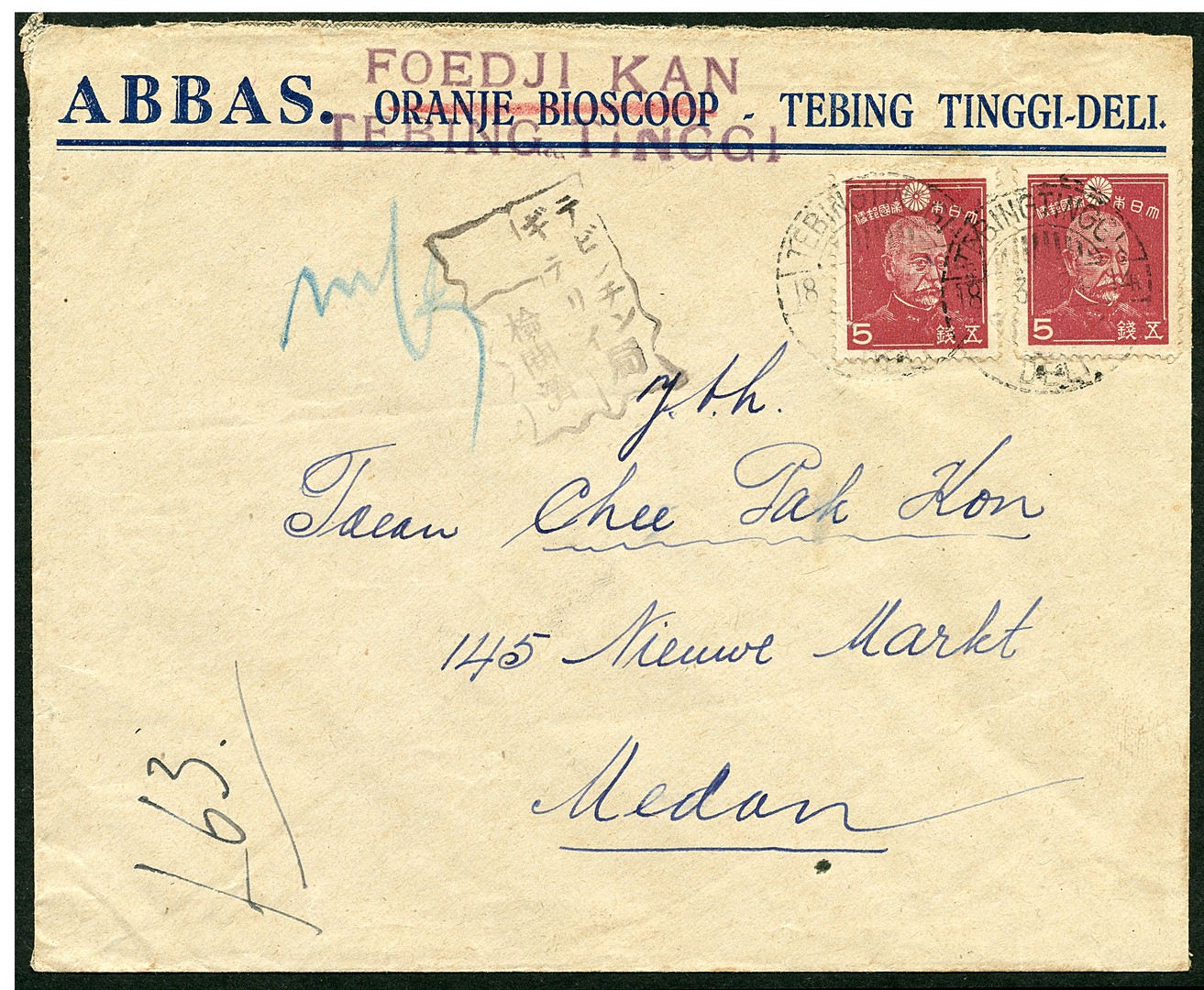 5 Sen Admiral Togo no. J3 (2x) on 'Foedji Kan' cover from Tebingtinggi- / Deli 18.3.24.14 to Medan. Censor Vr.312