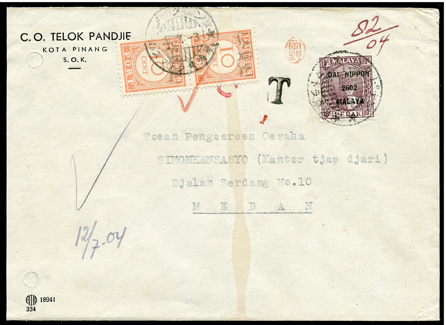 10 Cent Malaya no. M4 on cover (2 pinholes repaired) from Kotapinang 19.7.2 (type 200) to Medan, postage due of 10 cent with framed Dai Ni Hon overprint no. 83z-6a in pair affixed and cancelled 19.7.-3 (type 200) as if the Malayan stamp was invaled (or the cover was of the 2nd weight class). Censor Bu.JC16