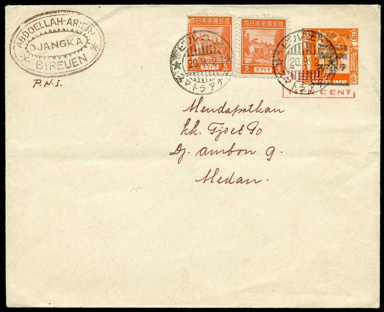 10 CENT KREISLER STATIONERY ENVELOPE WITH HANDSTAMP T-OVERPRINT Bu.RSN6 WITH 2x 5 CENT DEFINITIVE ADJACENT (1 DAMAGED) FROM BIREUEN 20.9.2 (TYPE 202) TO MEDAN. CERT. 'VAN DIETEN 2006'. THE ONLY COPY KNOWN (Bu.RRR) AND A SPECTACULAR EXHIBITION ITEM
