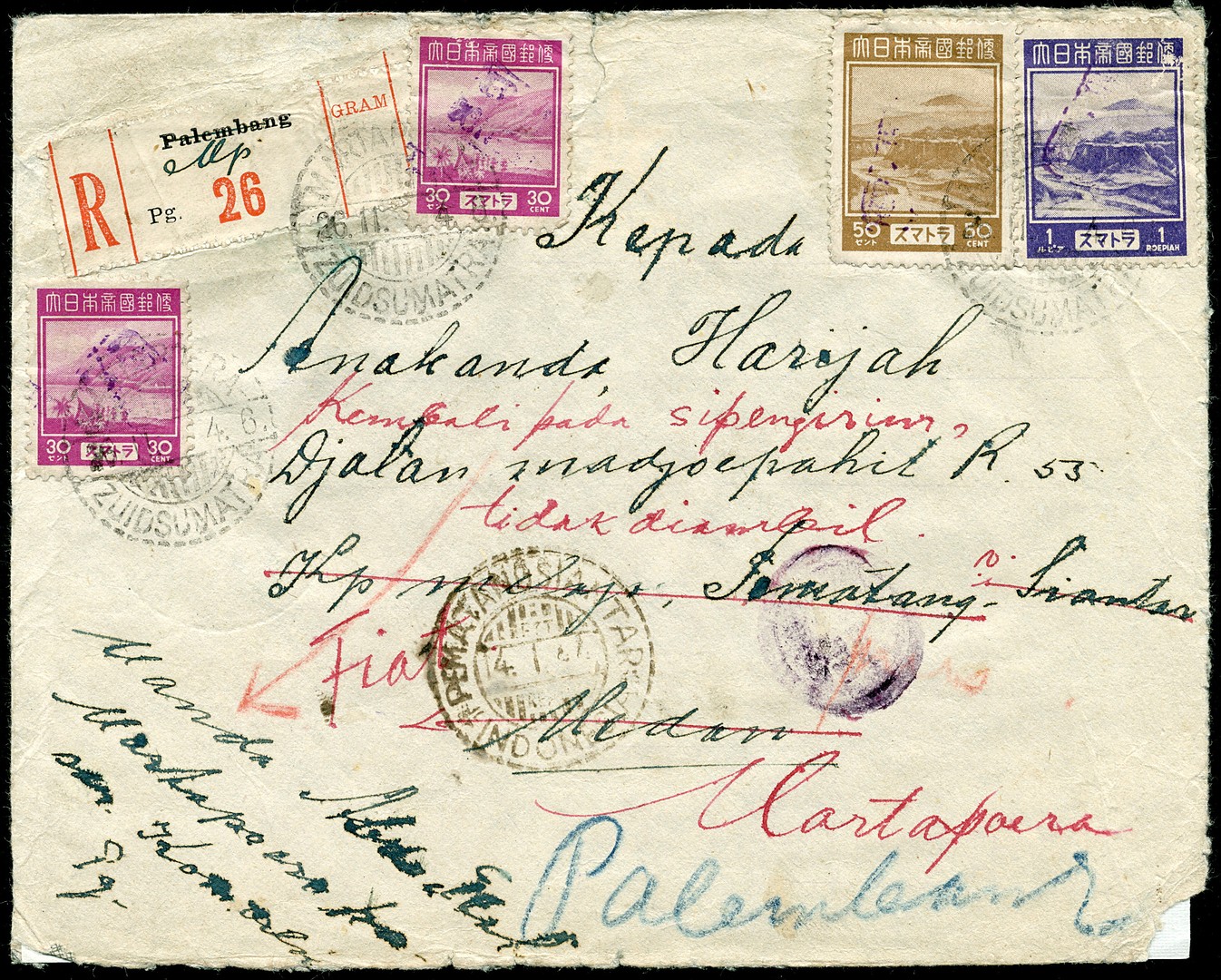 30 Cent, 50 cent and 1 roepiah definitive occupation issue for Sumatra all with violet overprint nos. 54v-94 (2x), 54v-96 and 54v-97 on registered cover from Martapoera- / Zuidsumatra 26.11.4.6 to Pematangsiantar 22.12.46, on 14.1.47 returned to sender ('tidak diambil' = not collected) 21.4.4.7. R-label from Palembang with pencil changed into 'Mp' = Martapoera. Unknown violet circular cachet