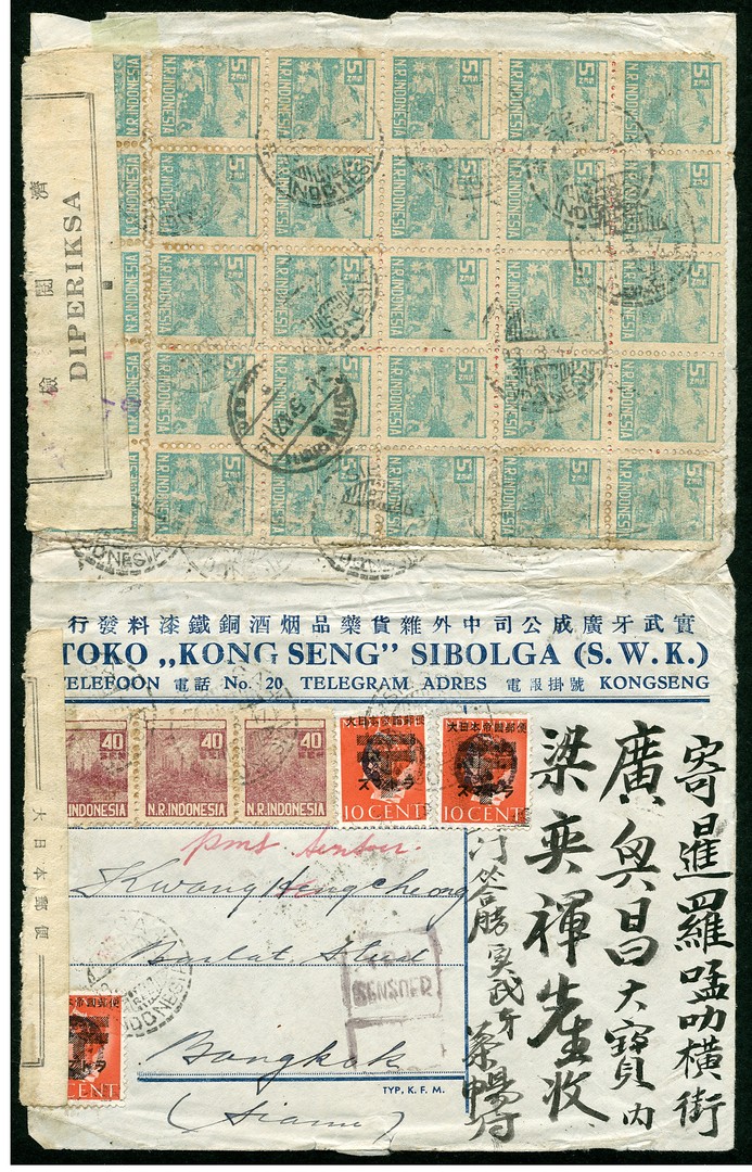 10 Cent van Konijnenburg with machine T and NRI-overprint no. 231z-92z-43' (3x), 5 sen no. 0130 (30x on the back) and 40 sen no. 0133 (3x) on company cover (opened on 3 sides) from Siboga 13.3.47 (type 250) to Bangkok, backstamped 21.5.'47. Censor label from the occupation period Bu.JCS8, censor mark Bu.RC31 and with red pencil written 'pms sensoer' and paraph, which could be done by a censor in Pematangsiantar (pms). Extremely rare and most interesting cover