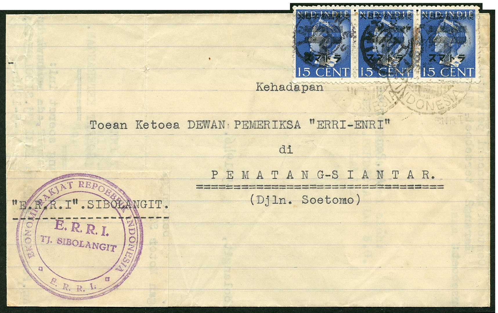 15 Cent van Konijnenburg with machine T and Indonesia overprint no. 221z-92z-44 in strip of three (faults) on homemade cover from Sibolangit via Medan (?) 24.5.46 to Pematangsiantar