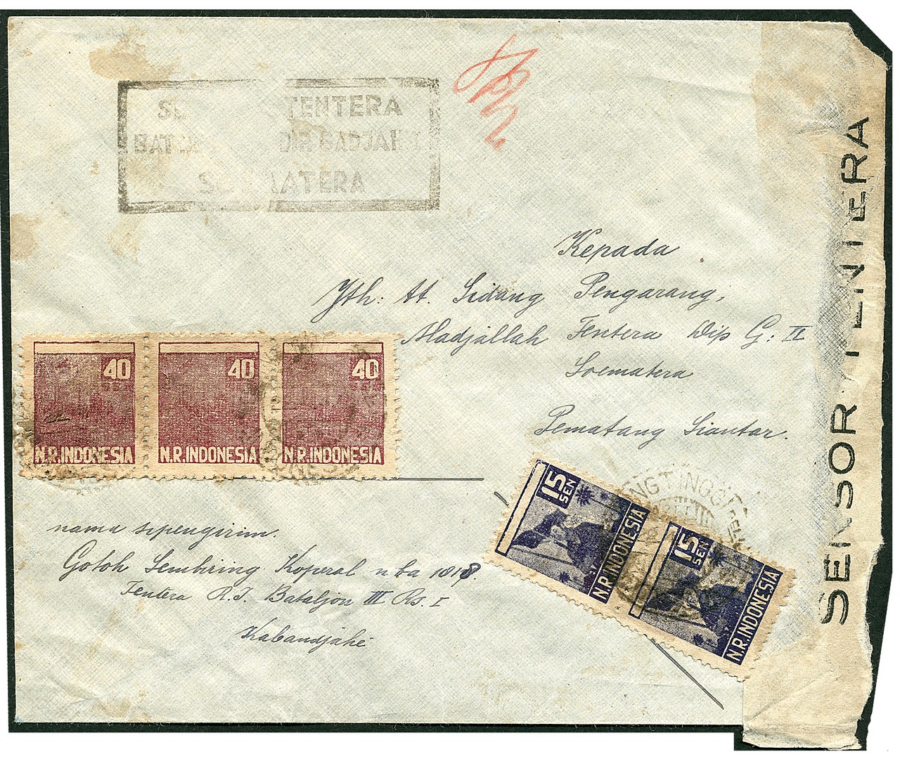 15 Sen no. 0131 in pair and 40 sen no. 0133 in strip of three on cover from Tebingtinggi-Deli 22.4.47 (type 250) to Pematangsiantar. Unrecorded military censor label 'SENSOR TENTARA' (89 mm) and framed censor mark 'SENSOER TENTARA / BAT:III RES:I DIP. GADJAH II / SUMATERA'