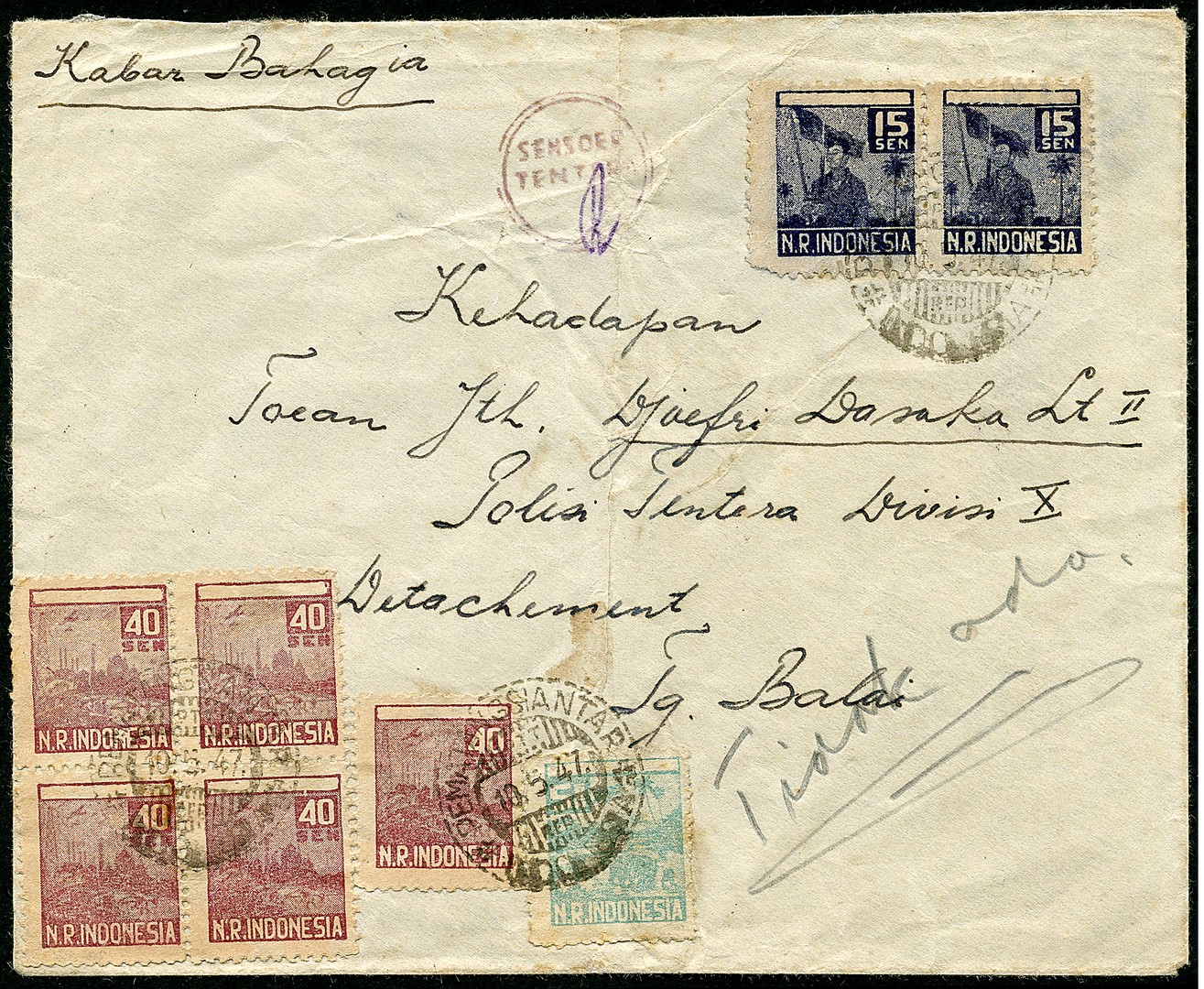 5 Sen no. 0130, 15 sen no. 0131 in pair and 40 sen no. 0133 single and in block of four on cover (crease, affecting 5 sen) from Pematangsiantar 10.5.47 to Tandjongbalai, but the addressee is not there ('Tidak ada'). Written 'Kabar Bahagia' (good news). Unrecorded circular military censor mark. Ex Tj de Jong