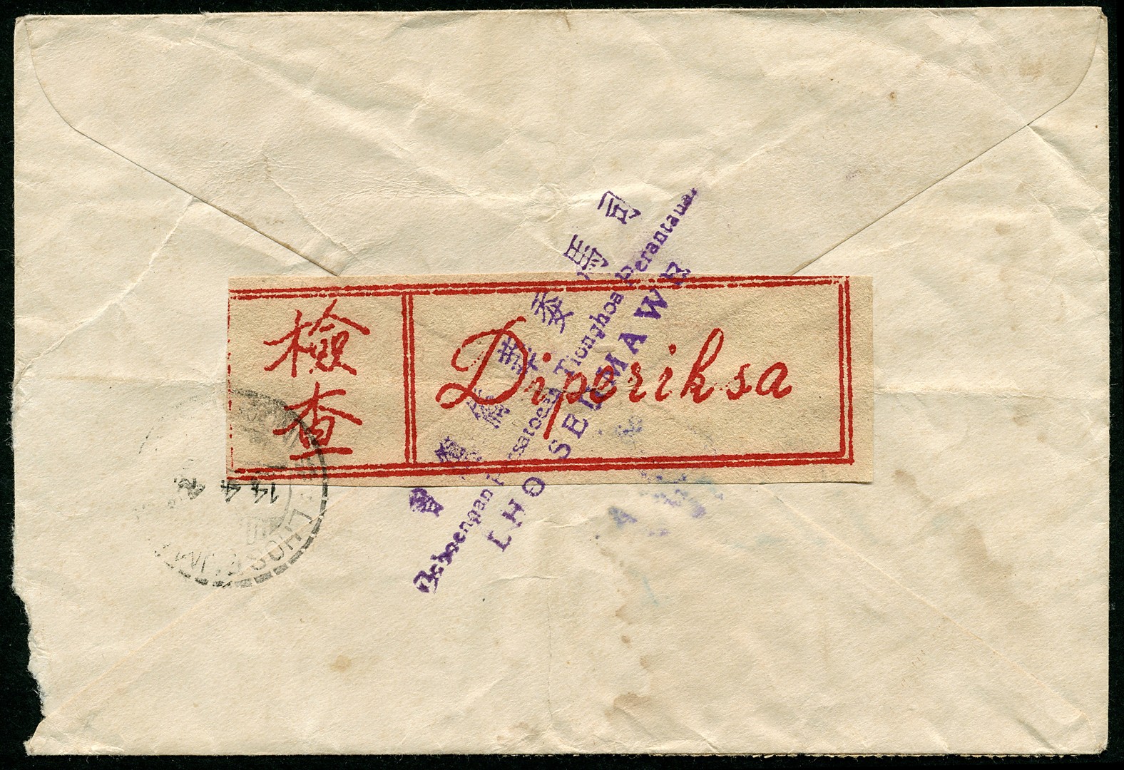 40 Sen with ORI overprint no. 71z-0133 (4x) on company cover (tear) from Lhoseumawe 14.4.49 to Penang. On the back a most unusual censor label