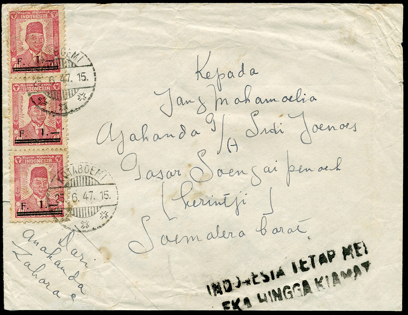 Emergency stamp F. 1.- no. 0144 in strip of three on cover from Kotaboemi 25.6.47.15 to Soengeipenoeh. Propaganda cachet type 481