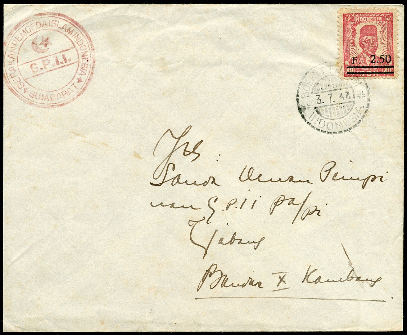 Emergency stamp F. 2.50 no. 0146 as a single franking on cover from the Indonesian Islamic Youth Movement in Boekittinggi 3.7.47 to Kambang (in West Sumatra)
