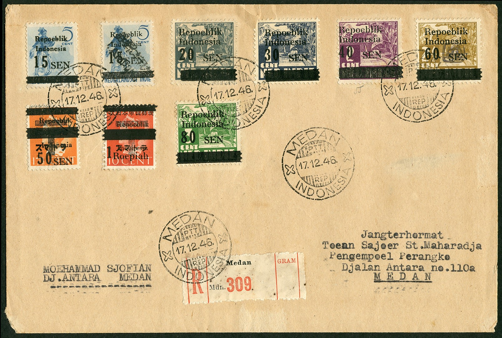 Four covers bearing six Malayan stamps with overprints (without address, Medan 21.3.46), eight different stamps with or without overprints (Medan 18.5.46, registered), eight different stamps with Japanese occupation and/or Indonesian overprints (Medan 17.12.46 registered) and ten different stamps without, with Japanese occupation and/or Indonesian overprints (Medan 30.12.46)
