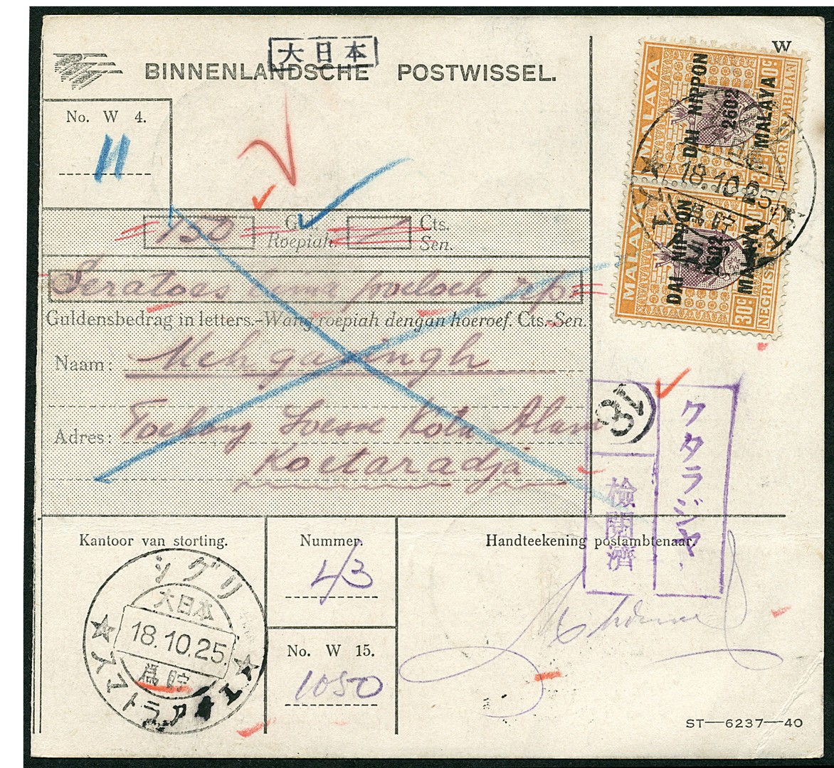 Atjeh. 10 Cent Malaya no. M14 from Koetaradja 18.9.27, 30 cent Malaya no. M12 in pair from Sigli 18.10.25, 5 sen Admiral Togo no. J3 from Sinabang 19.1.31 and 10 sen no. J10 from Takengon 19.1.19 on four M.O.'s with overprints 82r Koetaradja), 82z (Sigli) and 11v (Sinabang, Takegon)