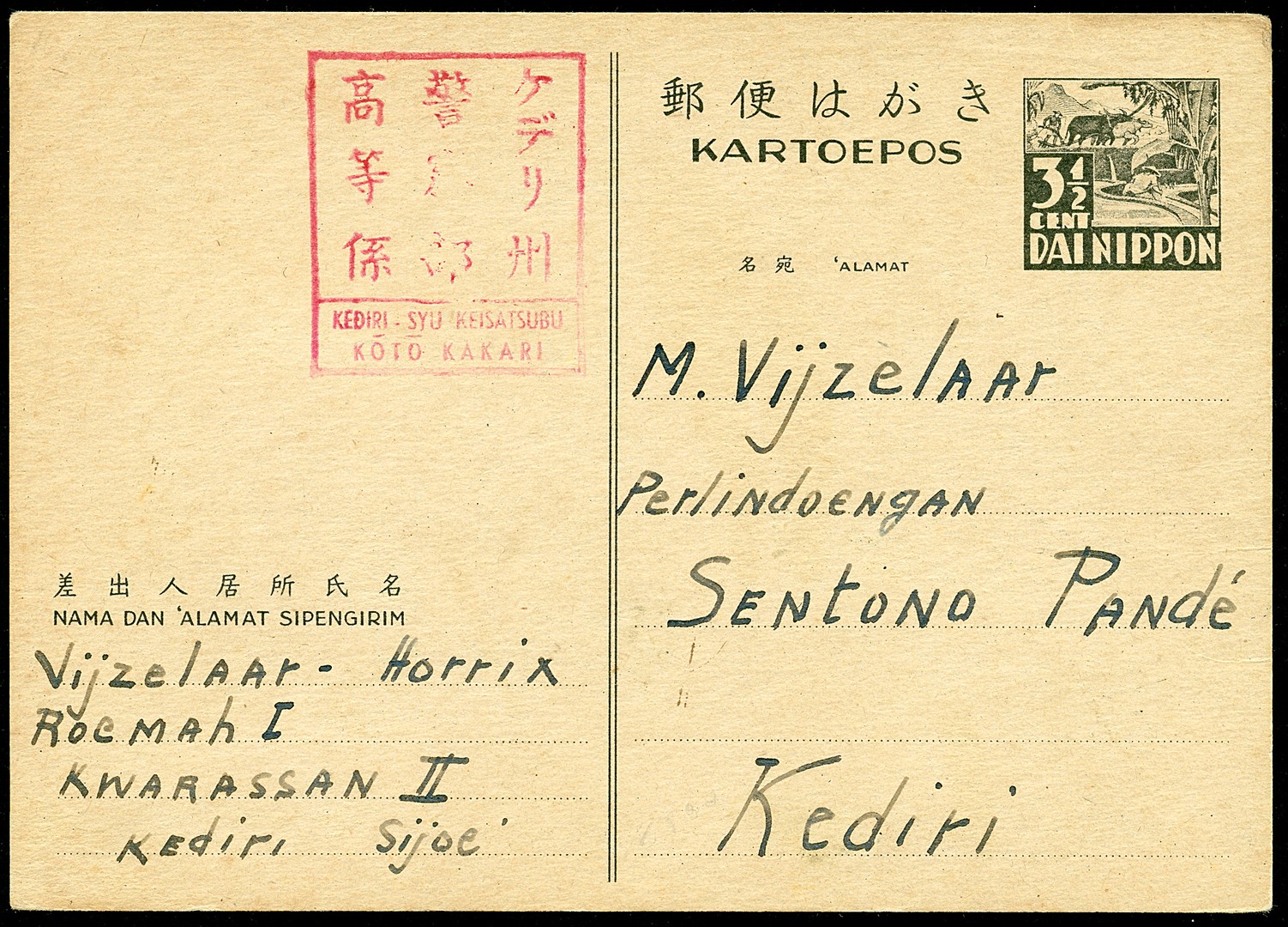 JAVA. 3½ Cent postcard Bu.3b from a wife in Camp Kwarassan II (the compound of an old Sugar plantation) in Kediri to her husband in Camp Sentono Pandé in Kediri. No postal marks but censormark Bu.JC51e