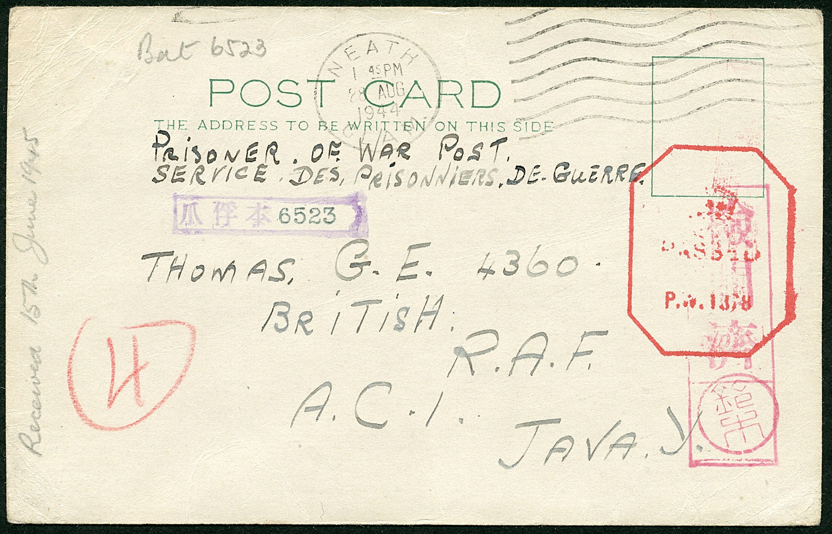GREAT BRITAIN. Postcard from Neath 28-8-1944 postage free to a British POW in Camp Java C (Soerabaja), received 15-6-1945, almost ten months later. British and Japanese censors Vr.201, and transit cancellation Bu.JC53d4