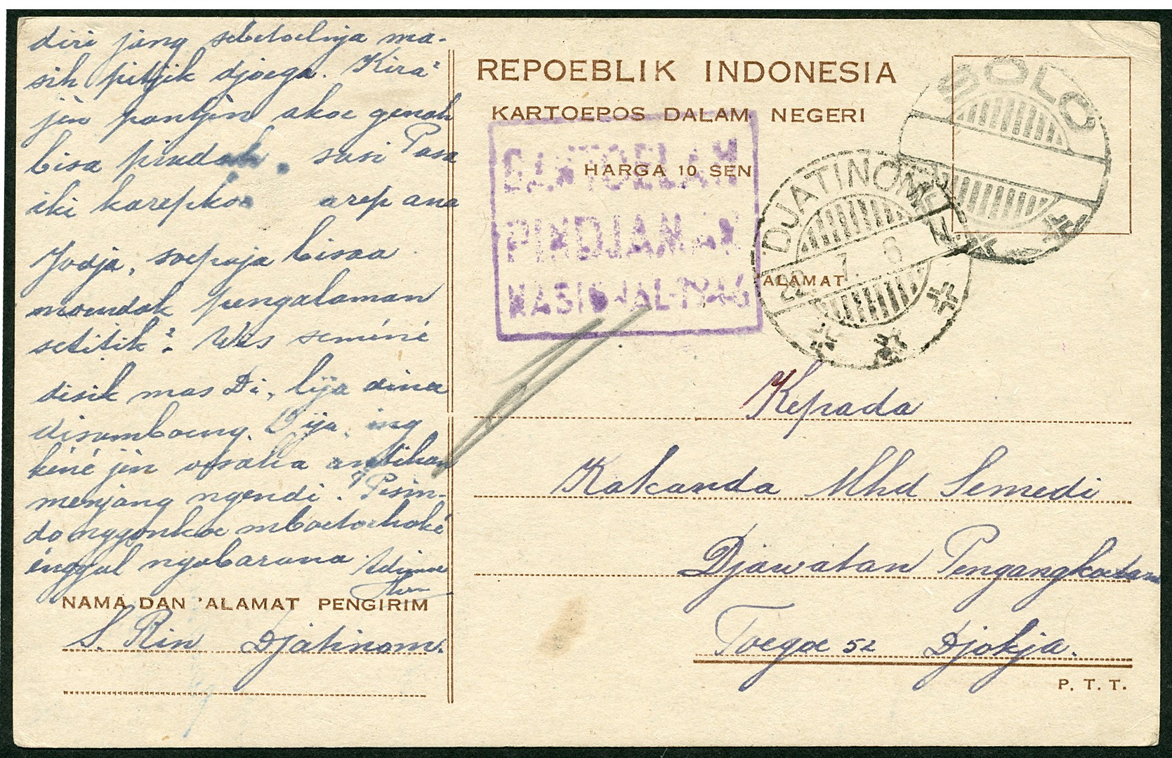 10 Sen postcard Bu.RJ13 with open bar cancellation from Solo, sent from Djatinom 22.7.6.11 to Djokjakarta. Propaganda cachet type 483
