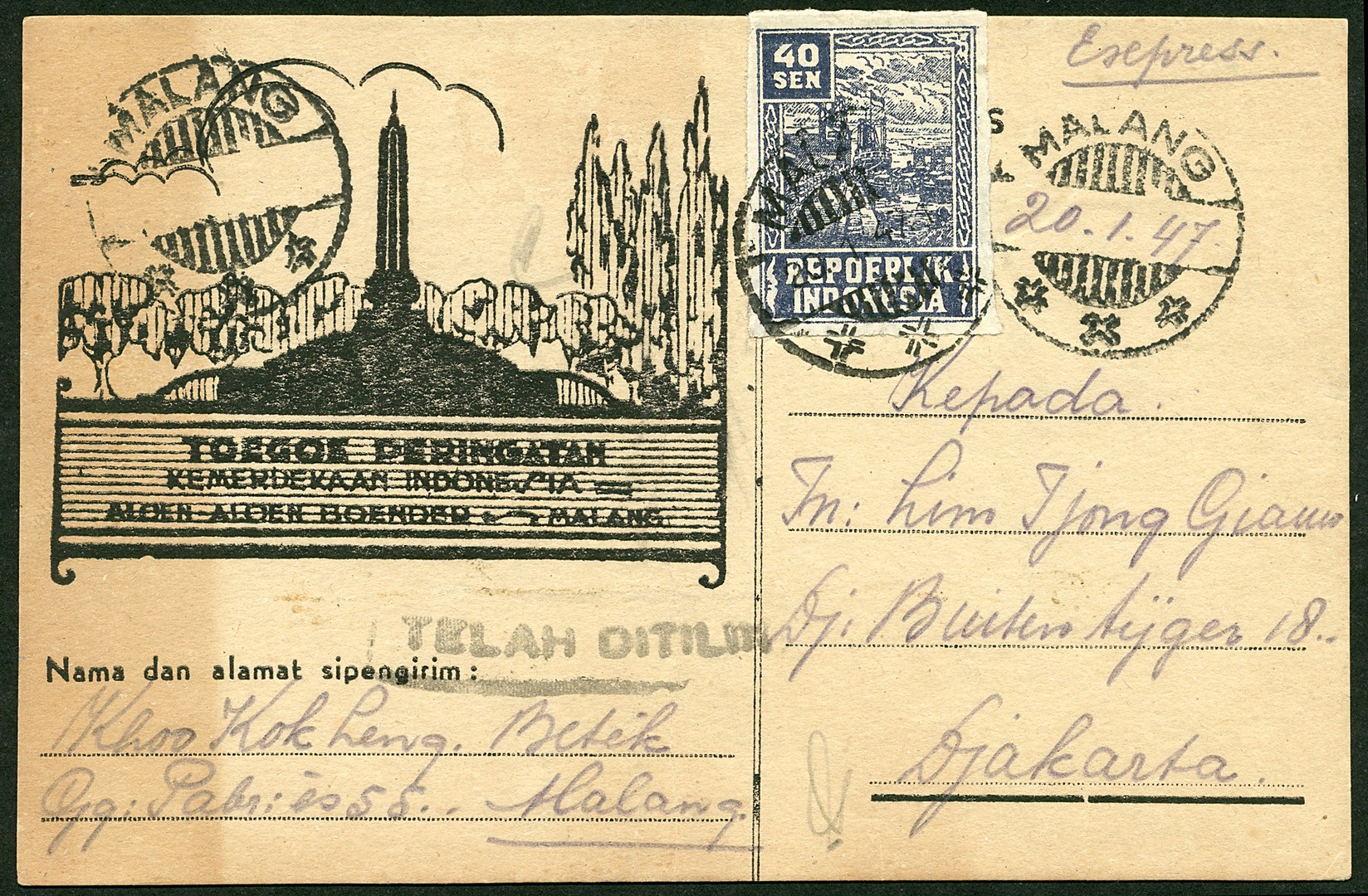 Propaganda postcard (10 sen) of Malang showing the 'Toegoe Peringatan' in the middle of the Aloen2 Boender, with open date bar of Malang (2x and the right cancellation with written date '20-1-47') Bu.RJ21f, with 40 sen no. 033A adjacent, by express from Malang 20.1.47.1. to Djakarta. Censor Bu.RC1b