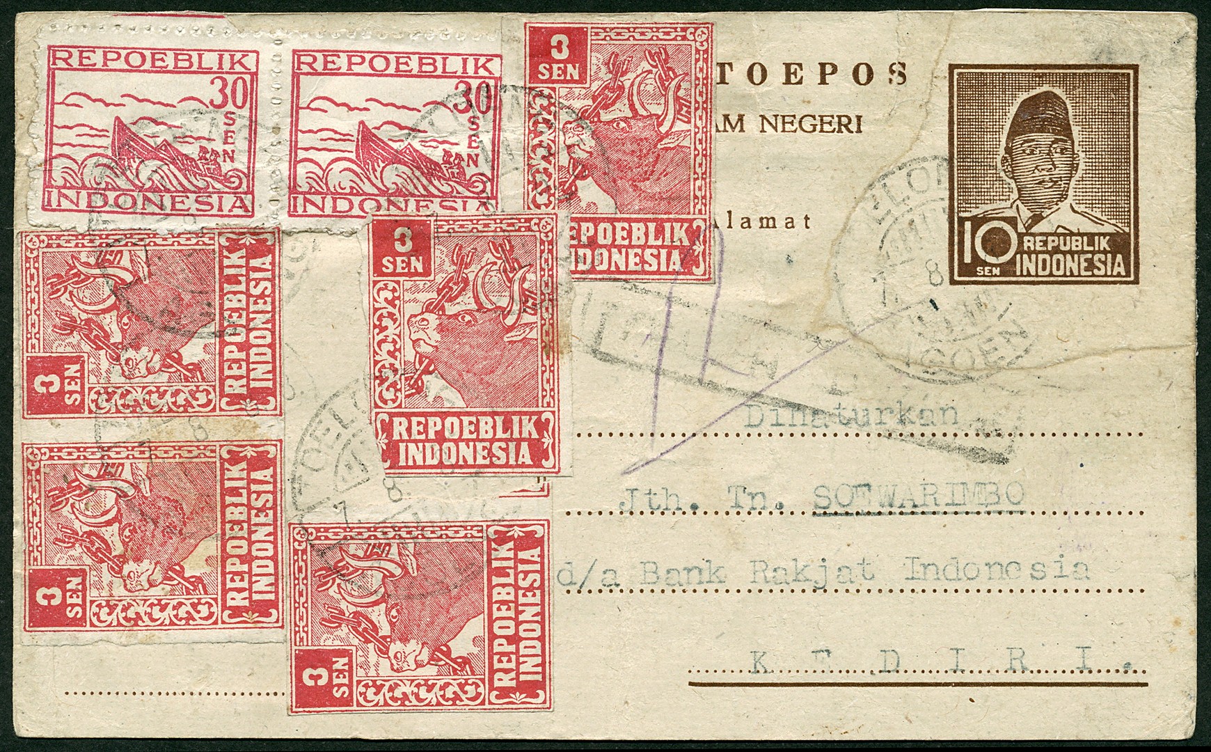 10 Sen postcard showing president Soekarno 'En Face' Bu.RJ23b (repaired) with additional franking of 3 sen no. 028A (5x) and 30 sen no. 027 in pair from Toeloeng- / Agoeng 7.8.8 to Kediri. Censor Bu.RC1b. See Bu. page 132 with regard to this additional franking