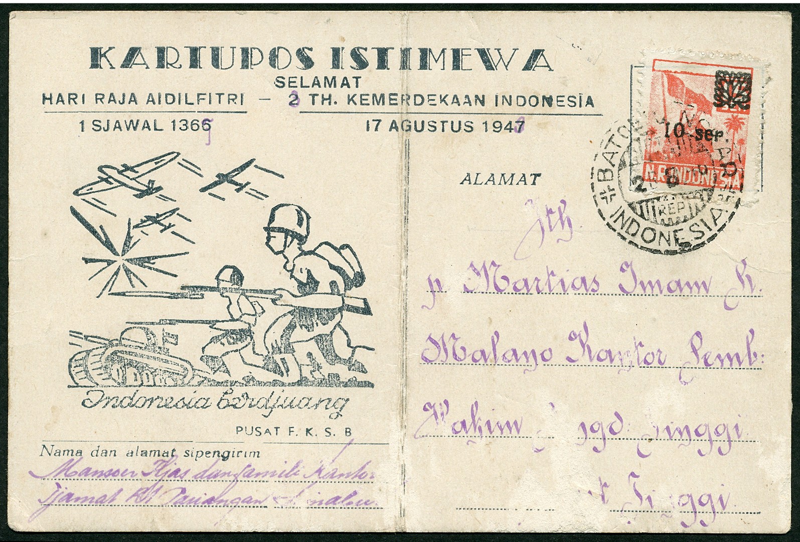 KARTOEPOS ISTIMEWA. 10 SEN NO. 0156 ON SPECIAL ILLUSTRATED POSTCARD (CREASE) COMMEMORATING ISLAMIC NEW YEAR AND INDEPENDENCE DAY, FROM BATOESANGKAR 26.8.48 (TYPE 250) TO BOEKITTINGGI. EXTREMELY RARE. CERT. 'VAN DIETEN 2005'