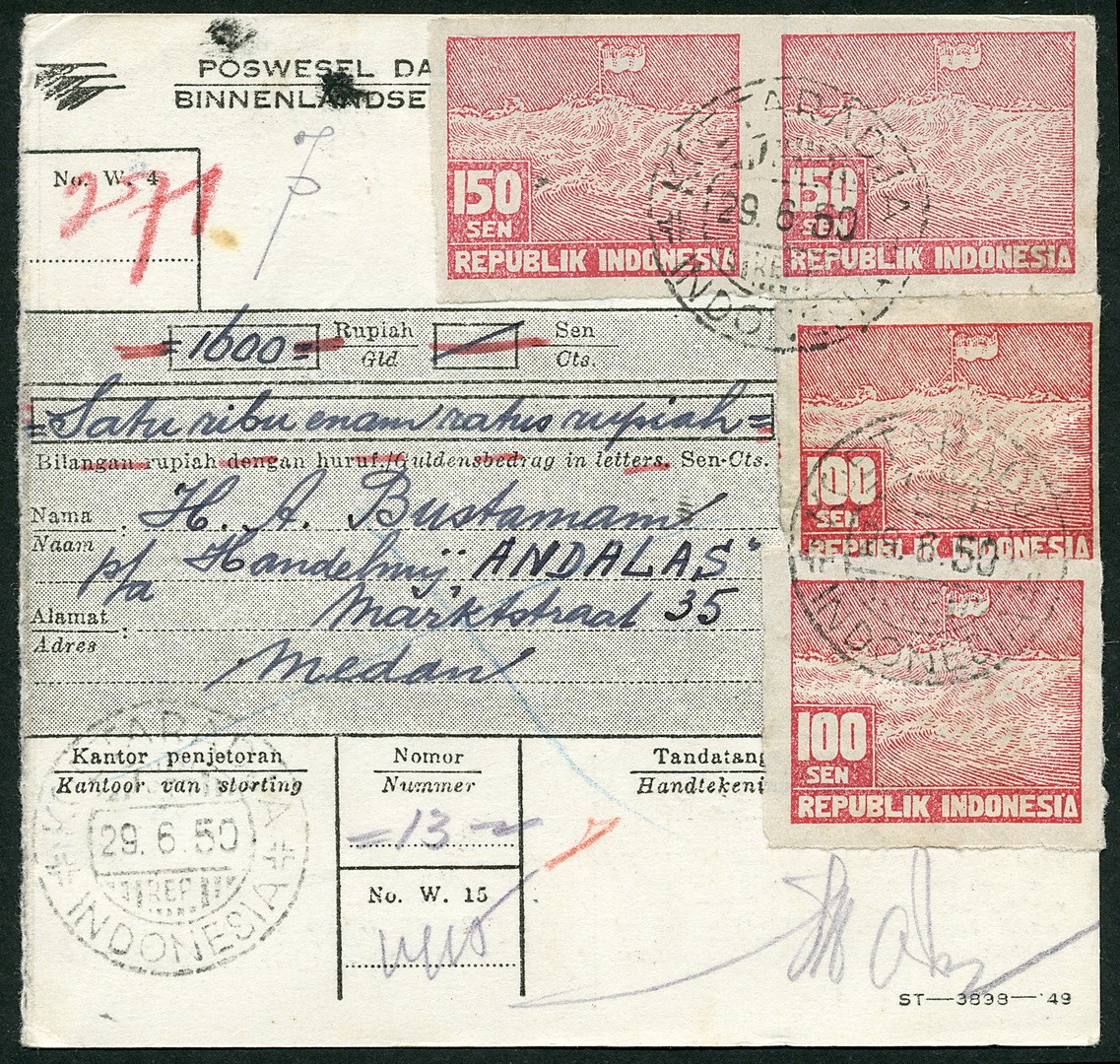 100 Sen no. 0201 (2x) and 150 sen no. 0202 (2x) on new M.O. with text in Indonesian and Dutch from Koetaradja 29.6.50 to Medan 1 30.6.50.17