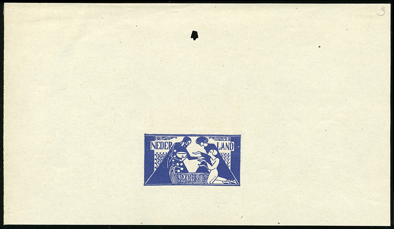 Jan Toorop 1923. Kleurproef van de 2 cent in de gekozen kleur oranjerood voor de 10 cent (onderste helft van in tweeën geknipt velletje), alsmede kleurproef van de 2 cent in de gekozen kleur violetblauw, doch niet in de gekozen waarde-aanduiding (bovenste helft van in tweeën geknipt velletje), ongegomd en op crème getint papier