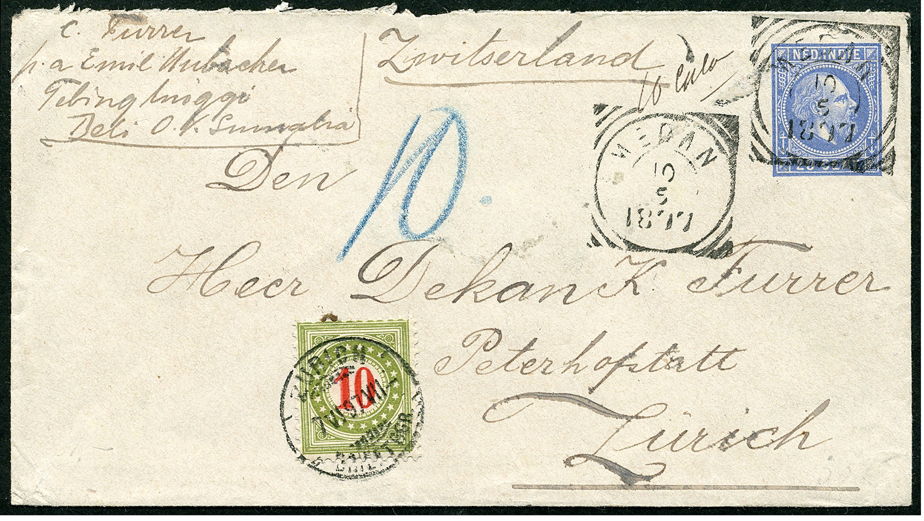 ZWITSERLAND. Env. G2 met 5 cent te weinig gefr. van Medan 10-5-1897 via de N.I.Postagent Penang 12-5 naar Zürich en daar op 7-6 beport