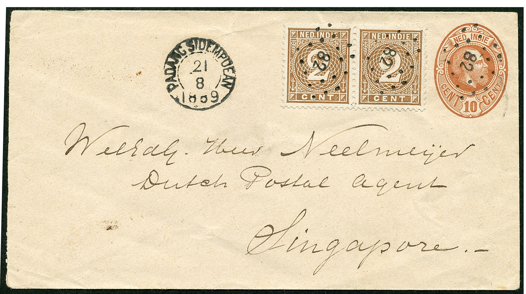 SINGAPORE. 2 Cent nr. 18A in paar op env. G6 van Padang Sidempoean 21-8-1889 via Padang 26-8, Weltevreden 31-8 en Singapore 3-9 naar de Nederlandse postagent aldaar. Prachtig poststuk, mooie afstempelingen, doch met 1½ cent te veel gefrankeerd (blijkbaar had afz. geen zegel van 2½ of 3 cent beschikbaar)