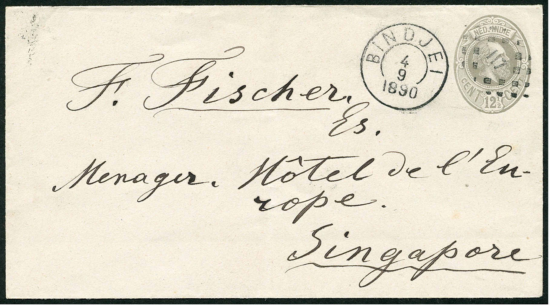 SINGAPORE. Env. G7 van Bindjei 4-9-1890 over Medan 4-9 naar een hotelmanager te Singapore 8-9. Prachtstuk, juist gefrankeerd, met luxe afstempelingen
