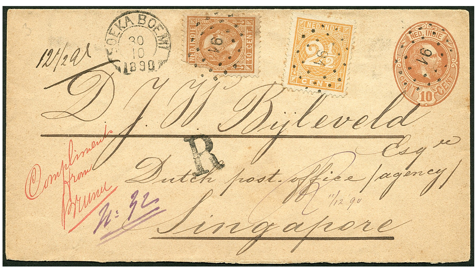 SINGAPORE. 10 Cent nr. 9 (mist deel) en 2½c nr. 19A op env. G6 van 12½ gr. aangetekend van Soekaboemi 30-10-1890 over Weltevreden 30-10 naar de Nederlandse postagent te Singapore 3-11