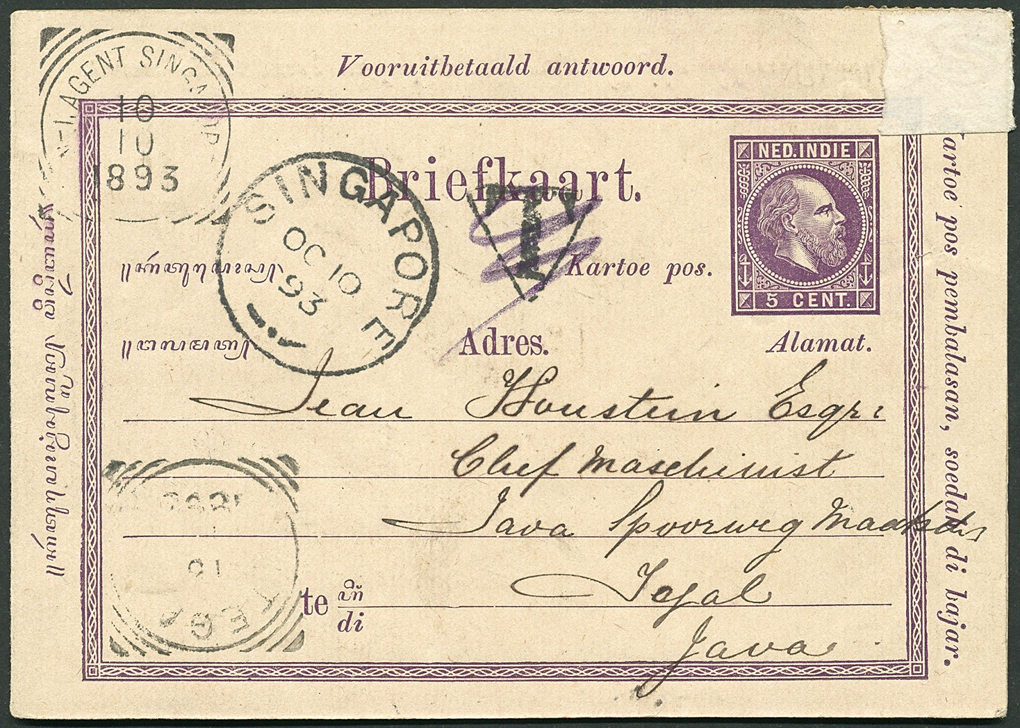 SINGAPORE. Dubbele bk. G2b, V-kaart van Tegal 30-9-1893 via Weltevreden naar Singapore 3-10, A-kaart van Singapore 10-10 via de N.I.Agent Singapore over Weltevreden 13-10 naar Tegal 15-10. De T in driehoek is doorgehaald, want het tarief naar de Staits Settlements is 5 cent. Zeldzaam poststuk!