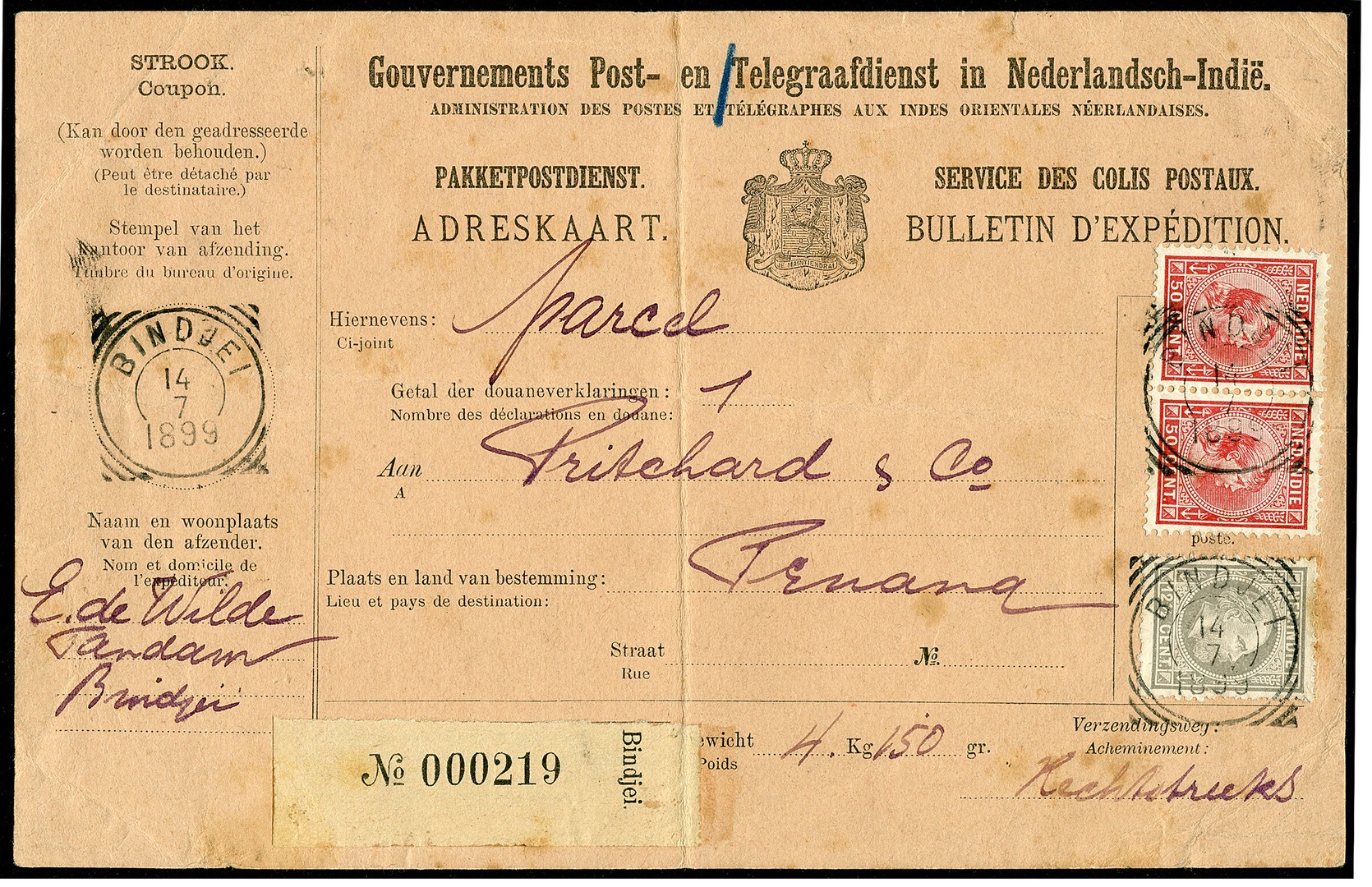 PENANG. 12½ Cent nr. 10H en 50c nr. 29 in paar op complete adreskaart voor de verz. van een postpakket van 4150 gr. van Bindjei 14-7-1899 naar Penang 11-8. De kaart heeft 2 vouwen, waarvan een door de rechter zegel van 50c, desalniettemin een zeer zeldzaam postaal formulier met mooie mengfrankering voor dit bijzondere tarief