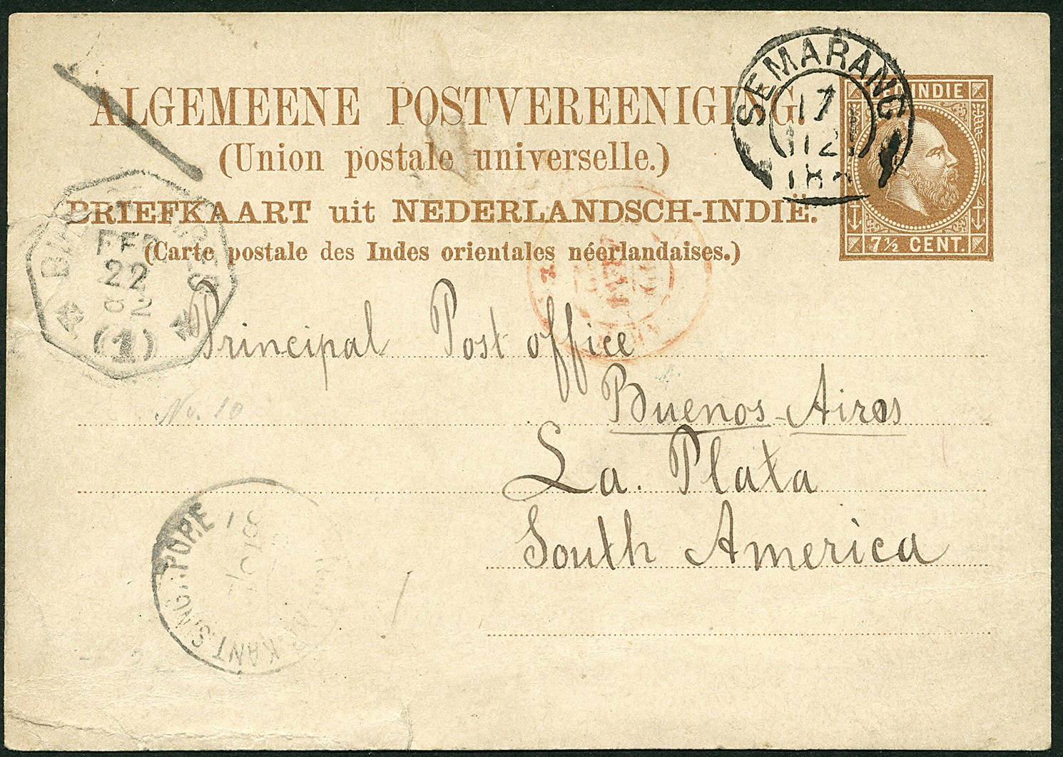 AMERIKA. ARGENTINIË. Bk. G5 (scheurtje) van Semarang 17-12-1881 over de N.I.Exp.Kant. Singapore naar Buenos Aires 22-2-1882