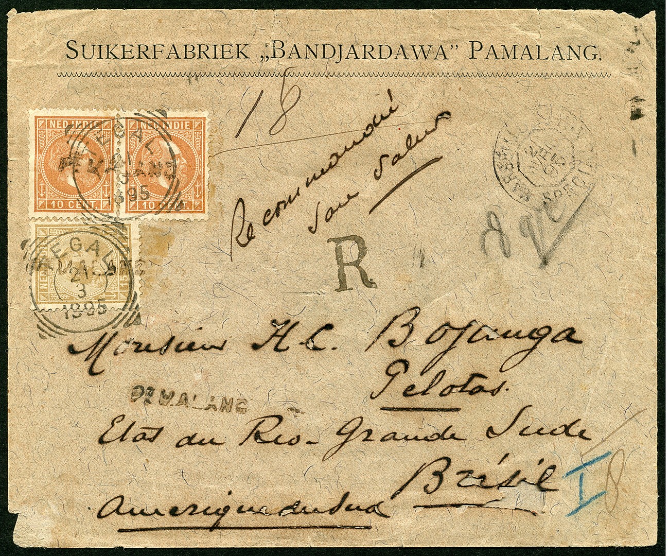 AMERIKA. BRAZILIË. 10 Cent nr. 9K (2x) en 15c nr. 25 op couvert van een suikerfabriek van 8 gr. aangetekend van PEMALANG (naam,stempels ook op zegels) over Tegal 21-3-1895 per Franse pakketboot deels per traject Marseille à Lyon 21-4 via Rio de Janeiro 21-5 naar Pelotas (ter versteviging is over aankomststempel stukje papier geplakt). Couvert is wat kwetsbaar (o.a. inktvraat) maar overigens mooie mengfrankering en naar zeldzame bestemming