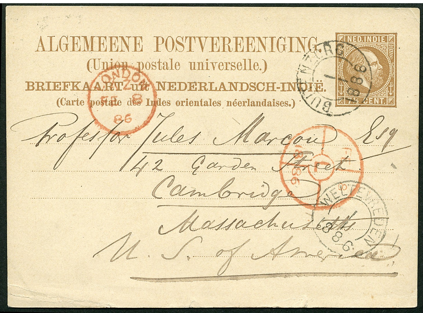 AMERIKA. USA. Bk. G5 van Buitenzorg over Weltevreden op Nieuwjaarsdag 1886 via Londen 8-2 naar een hooggeleerde heer te Cambridge