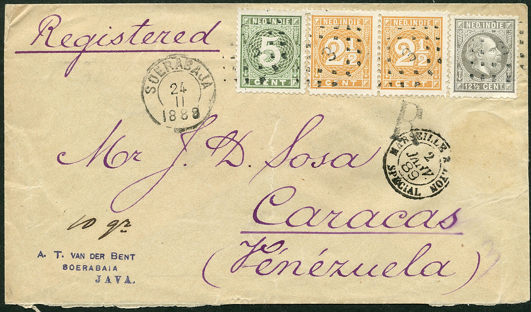 AMERIKA. VENEZUELA. 12½ Cent nr. 10H, 2½c nr. 19A in paar en 5c nr. 21C op env. van 10 gr. (een zegel van 12½c ontbreekt) aangetekend van Soerabaja 24-11-1888 over Weltevreden, per traject Marseille à Lyon 2-1-1889 naar Caracas. Tevens 2½ Cent nr. 19D op bk. G2b (V-kaart) van Wlingi 7-10-1896 over Kediri en Weltevreden naar Caracas