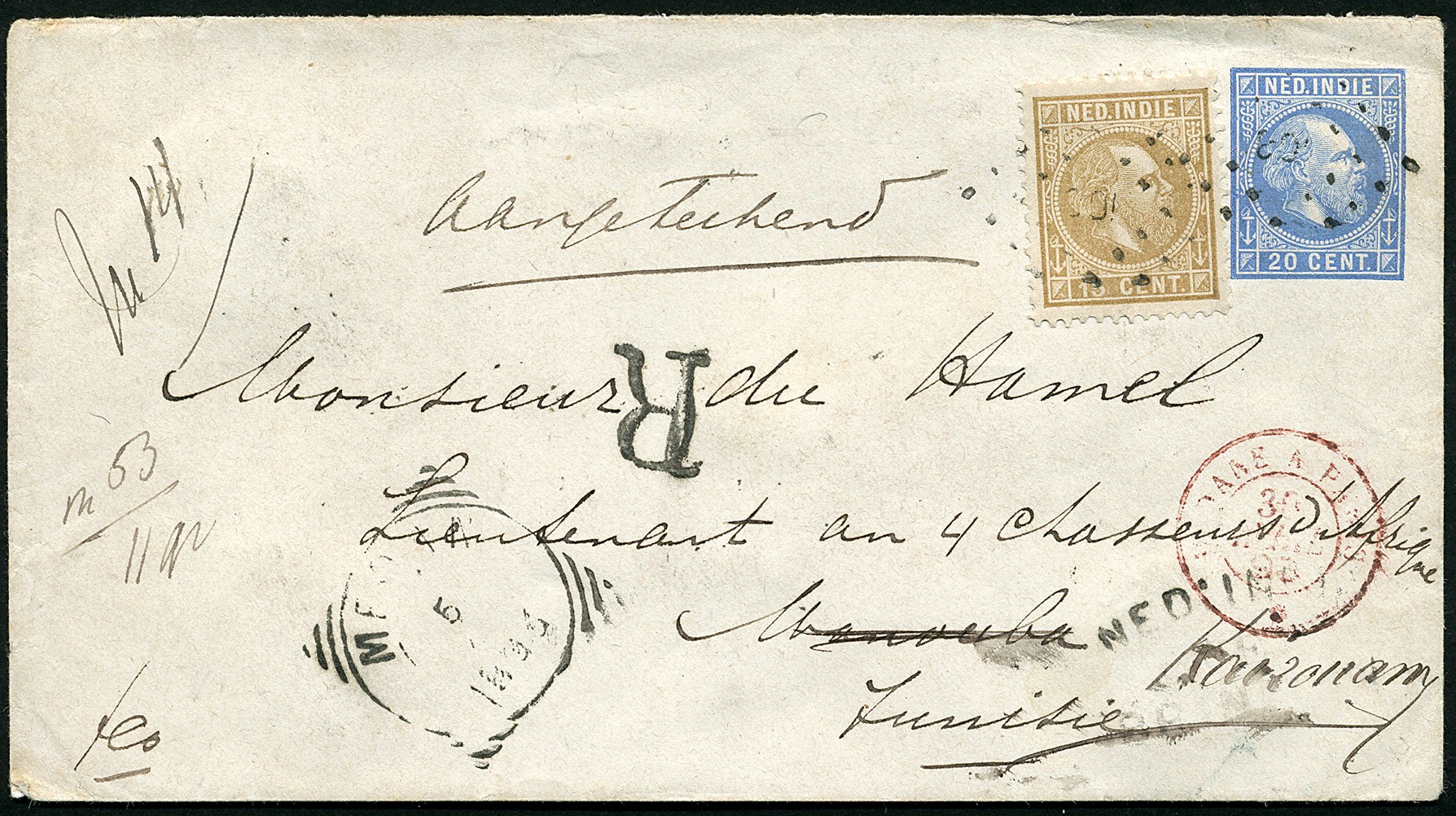 AFRIKA. TUNESIË. 15 Cent nr. 11F op env. G2 van 11 gr. aangetekend van Medan 5-4-1893 (combinatie vierkant- + puntstempel 108, voor Medan zeldzaam!) via de N.I.Postagent Penang 6-4, traject Modane à Paris 30-4, Marseille 30-4 over Tunis 4-5 naar Manouba, doorgez. naar Kairouan. Zeldzame bestemming!