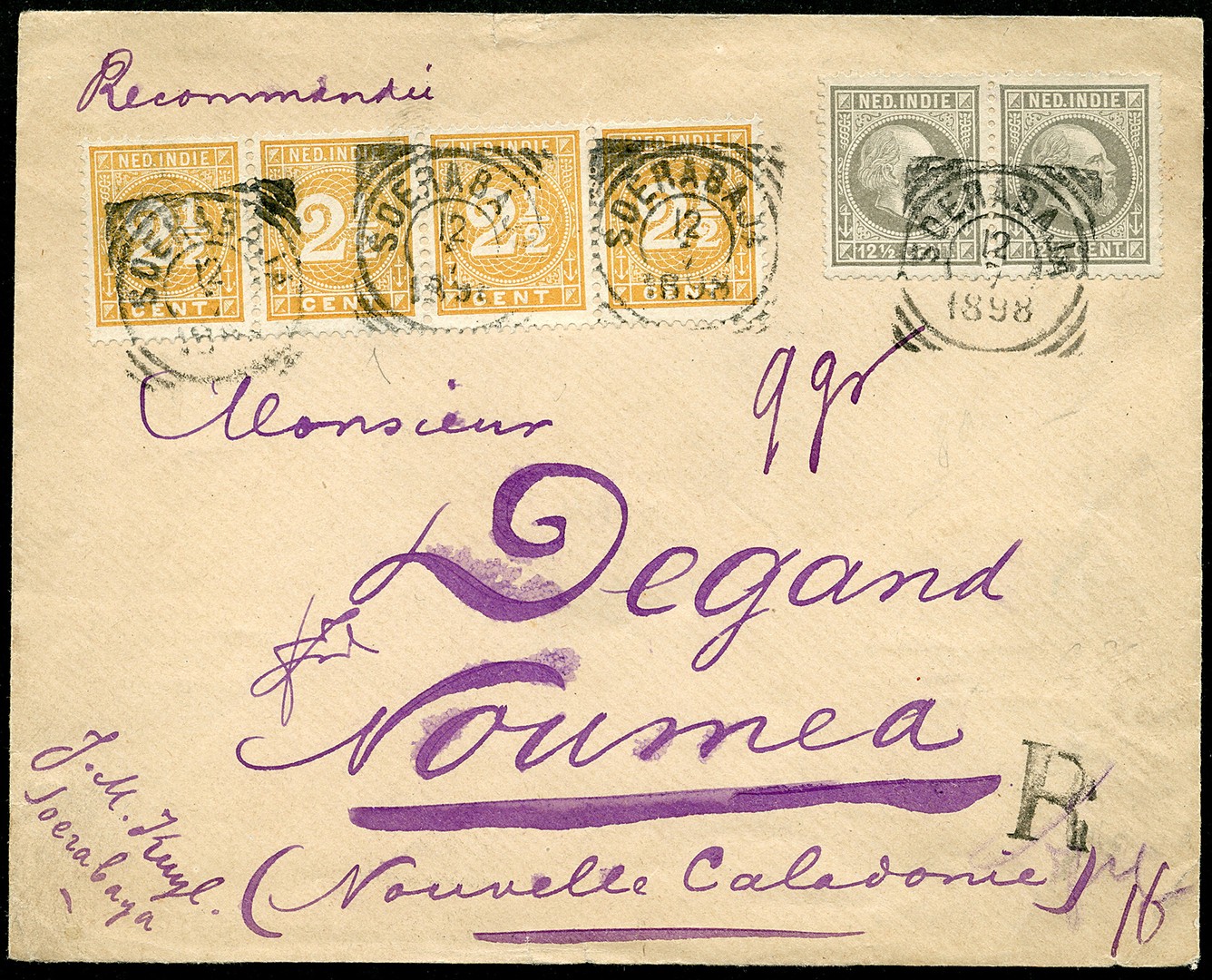 OCEANIË. NIEUW-CALEDONIË. 12½ Cent nr. 10H in paar en 2½c nr. 19D in strip van vier op env. van 9 gr. aangetekend van Soerabaja 12-7-1898 via Weltevreden 14-7 naar Noumea 25-9. Prachtige brief, correct gefrankeerd, die na een reis van ruim 2 maanden op deze uitermate zeldzame bestemming arriveerde