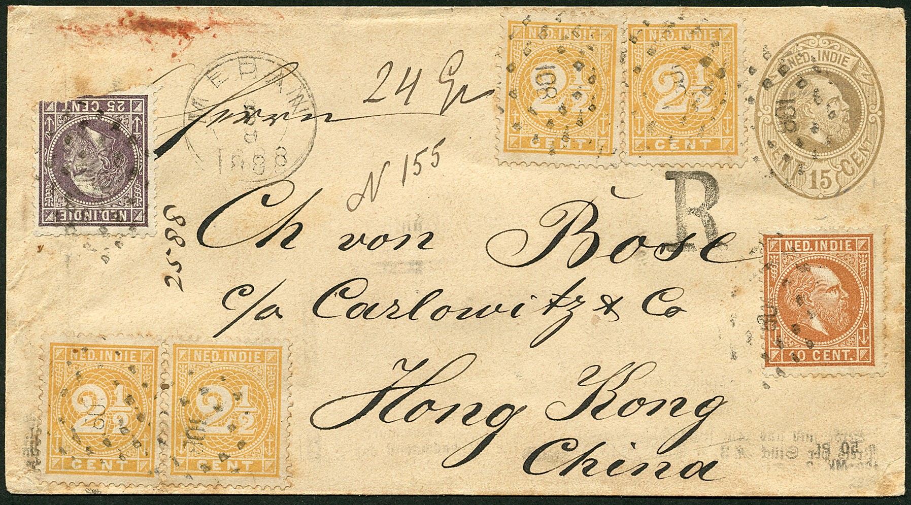 AZIË. HONG KONG. 10 Cent nr. 9H, 25c nr. 13 (mist deel) en 2½c nr. 19A (4x) op env. G8 van 24 gr. aangetekend van Medan 8-9-1888 via Ned.Ind. Penang 10-9, Ned.Ind. Singapore 14-9 naar Hong Kong 24-9