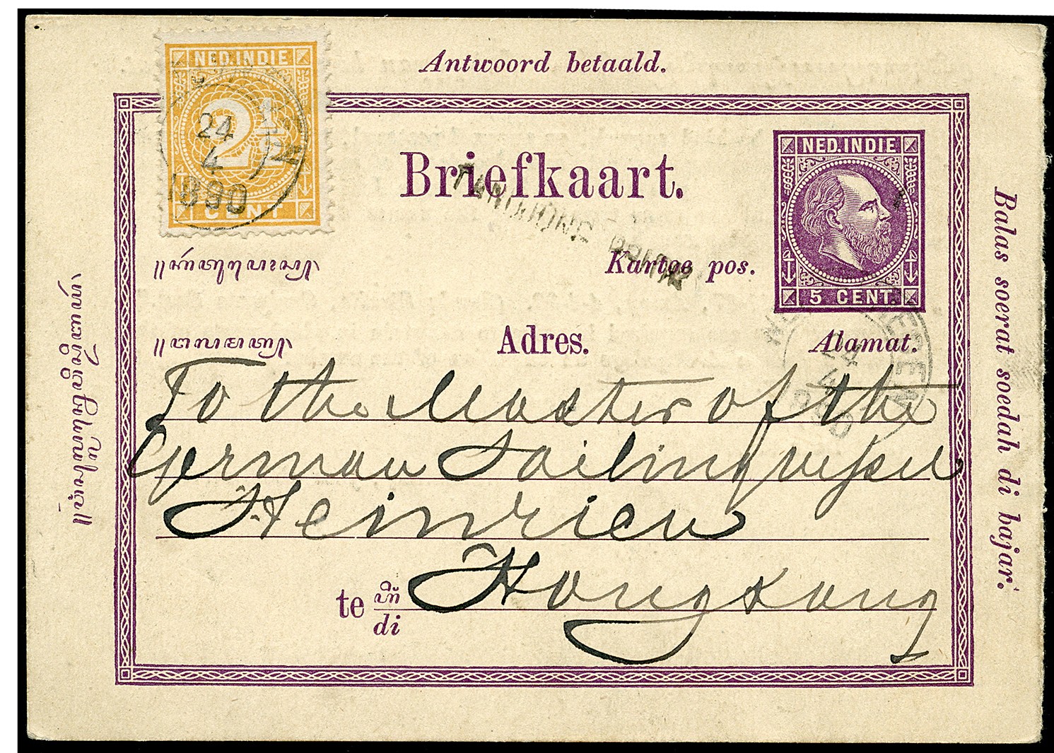 AZIË. HONG KONG. 2½ Cent nr. 19A op bk. G2a (V-kaart) van TANDJONG PRIOK via Weltevreden 24-4-1890 naar 'the Master of the German Sailingvessel Heinrich' te Hong Kong. De az. is bedrukt met scheepsinfo, de verwijderde A-kaart bevat de namen van de havens en vertrektijden van schepen die varen door de Nederlands-Indische wateren. Interessante kaart, vooral ook voor de liefhebber van scheepspost