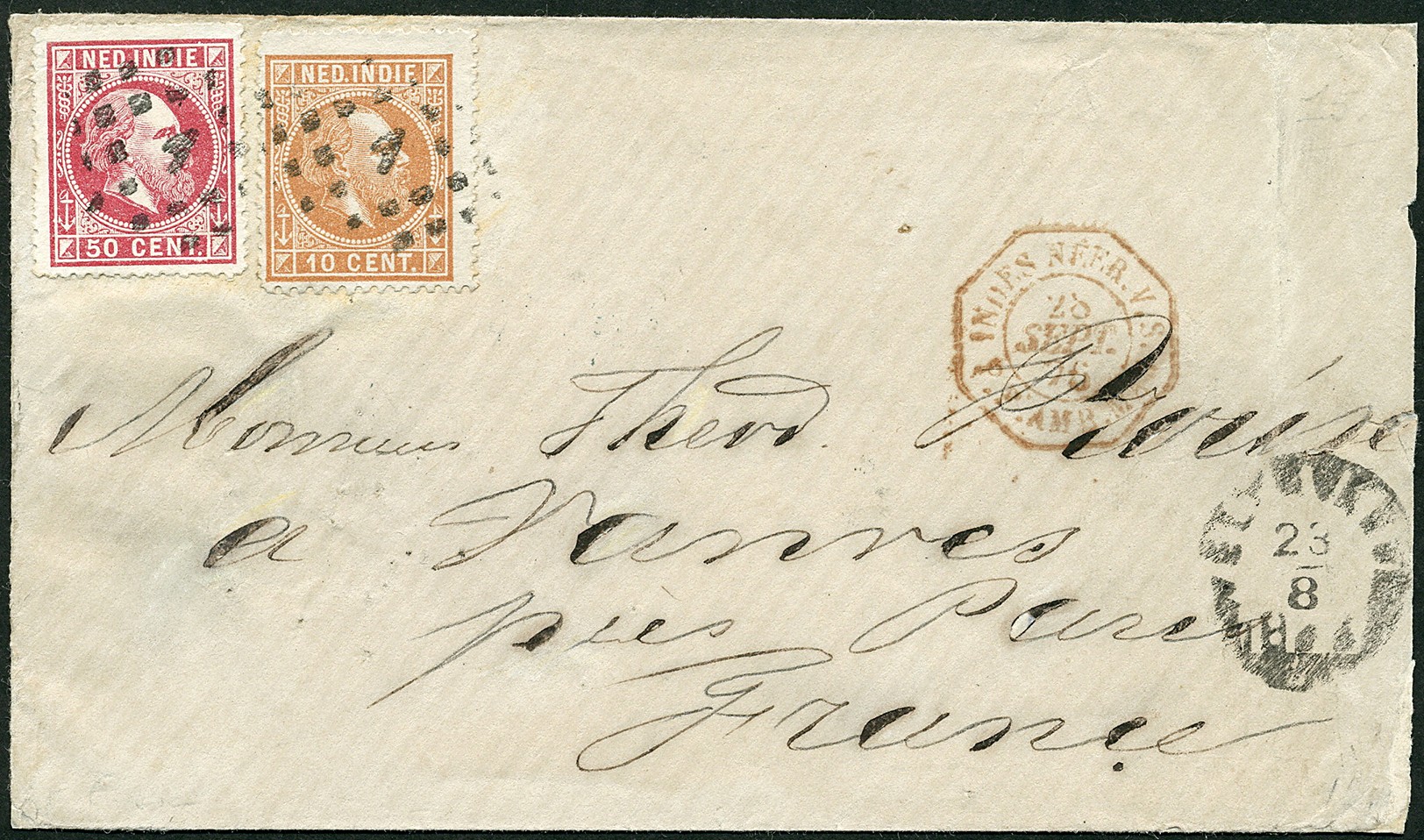 INDES NÉER.V.S. / P.F.AMB.MAR. (Salles V, 1.891). Prachtige afdruk op env. (rechts iets ingekort) gefr. met 10c nr. 9C en 50c nr. 15A van Weltevreden 23-8-1876 met de Franse pakketboot 28-9 via Suez, per traject Lyon à Paris 28-9 naar Vanves 29-9. Zeldzaam!