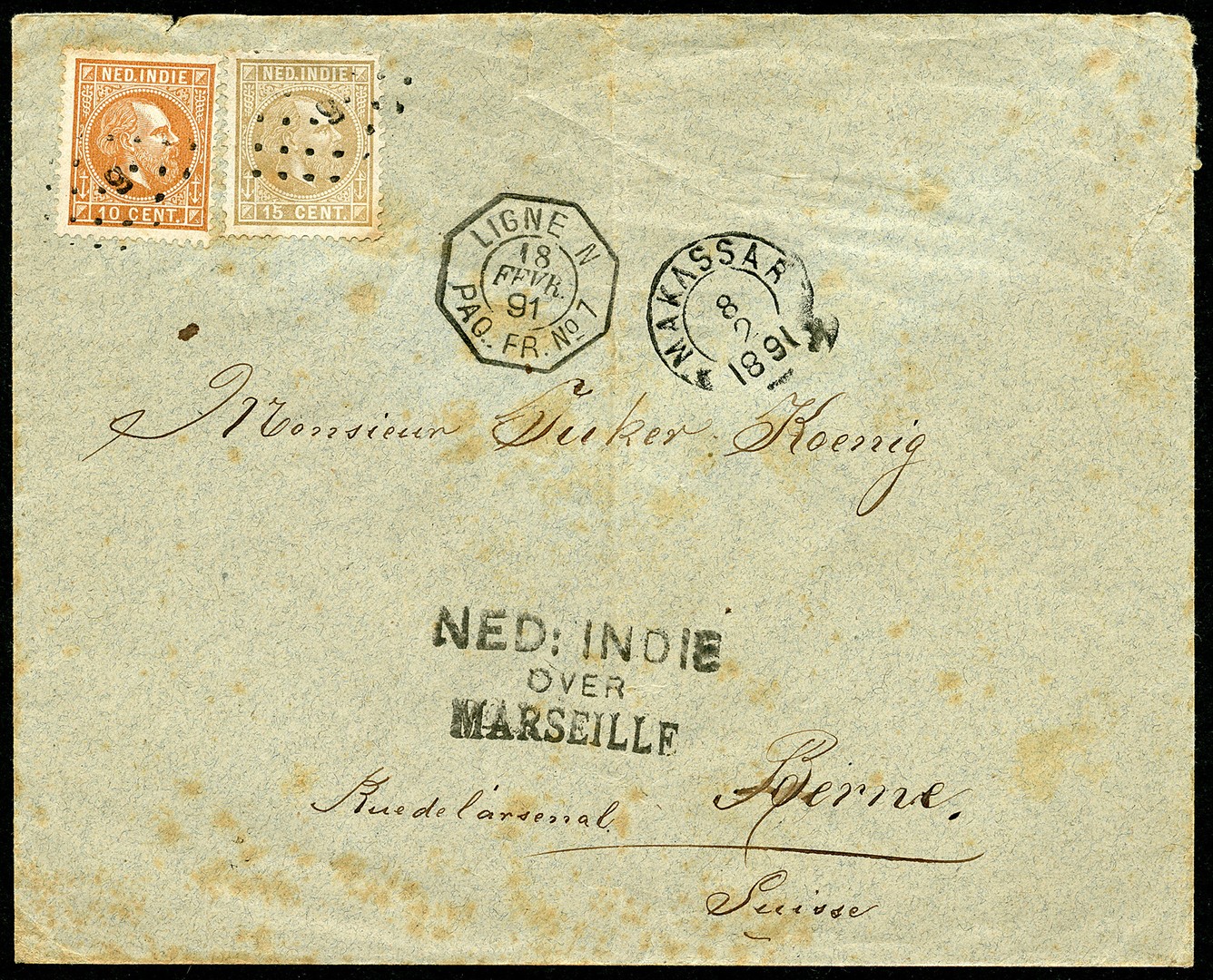 LIGNE N / PAQ.FR.No. 7 (Salles V, 1.924 /7). Luxe afdruk op wat minder mooie env. (o.a. klep ontbreekt) waarop 10c nr. 9K en 15c nr. 11F van Makassar 8-2-1891 via de Ned.Ind. Singapore 18-2 met de Franse pakketboot 18-2 over Marseille naar Bern 14-3