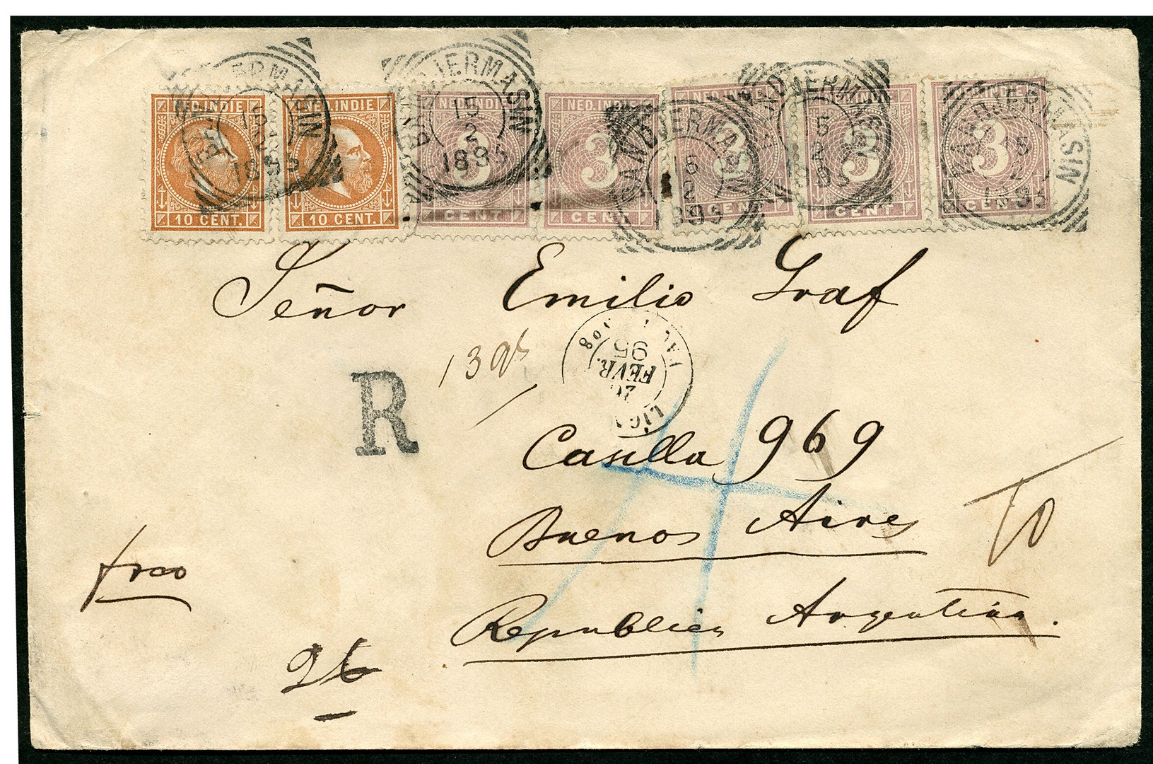 LIGNE N / PAQ.FR.No. 8 (Salles V, 1.921 /8). Herkenbare afdruk op env. van 13 gr. gefr. met 10c nr. 9K (2x) en 3c nr. 20D (5x, 2 ex. zeer fraai, dikke schrijfinkt door linker zegels zichtbaar) aangetekend van Bandjermasin 15-2-1895 via Weltevreden en Bordeaux 21-3 naar Buenos Aires, Argentinië, 15-4
