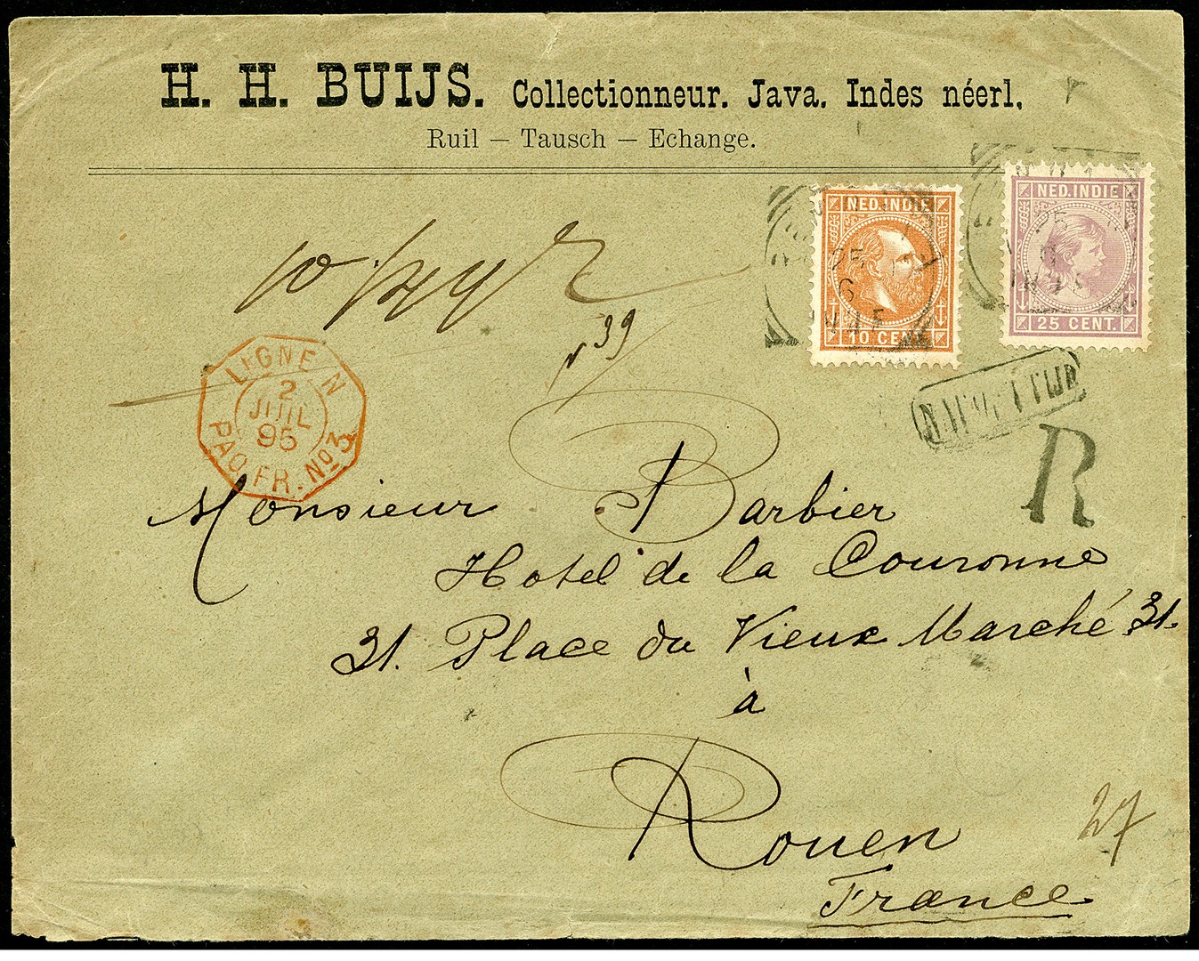 LIGNE N / PAQ.FR.No. 3 (Salles V, 1.924 /3). Luxe afdruk in rood op couvert van een trotse 'Collectionneur', briefgewicht 10½ gr., gefr. met 10c vader en 25c dochter, aangetekend van Besoeki 25-6-1895 via Semarang en Weltevreden met de Franse pakketboot 2-7 naar Rouen 27-7. Prachtig pakketbootstempel op fiere brief met fraaie mengfrankering!